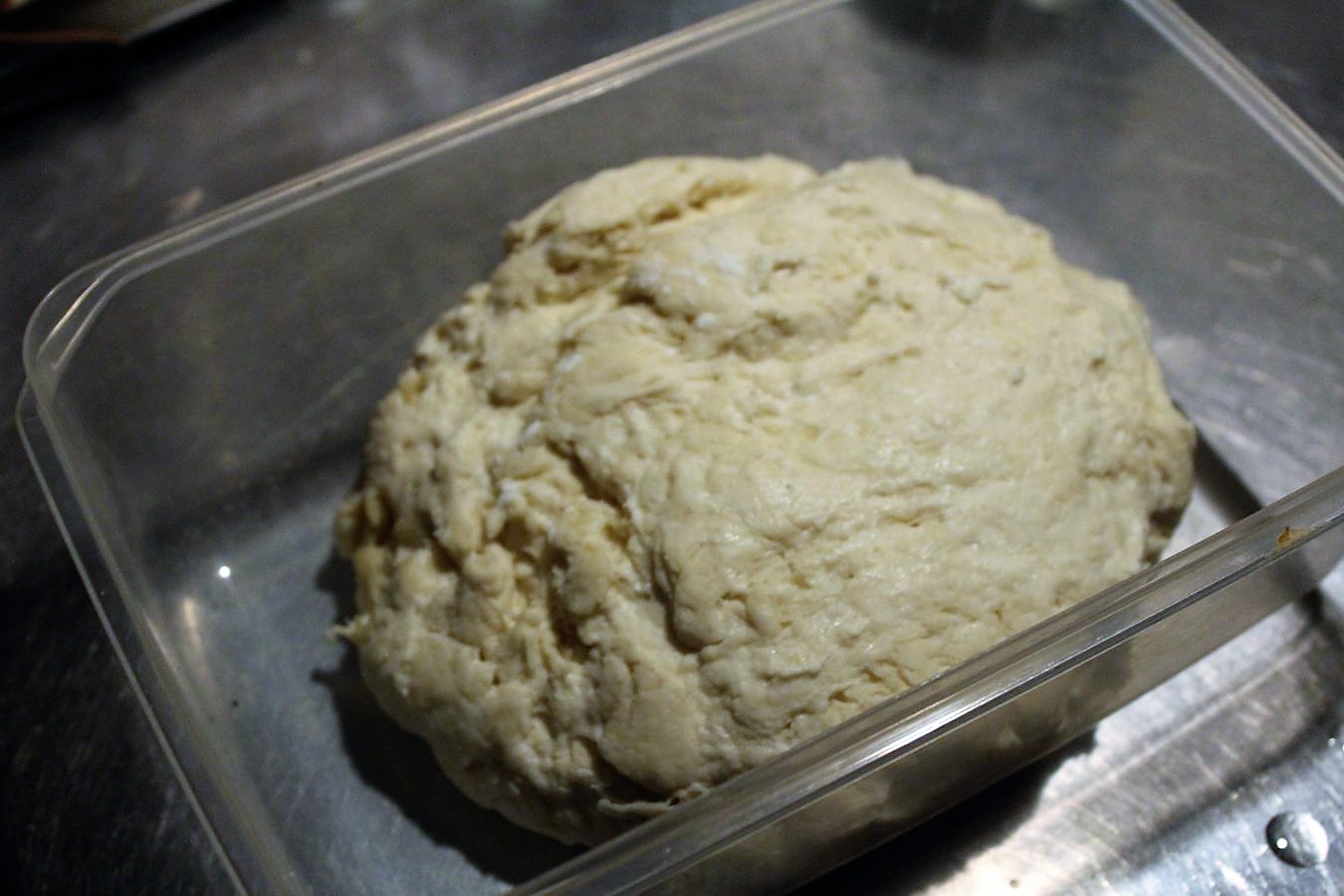Den Teig abgedeckt mindestens 1 Stunde stehen lassen, aber wie gesagt es war mitten in der Nacht und ich habe den Teig deswegen in einer Gefrierdose im Kühlschrank gelagert