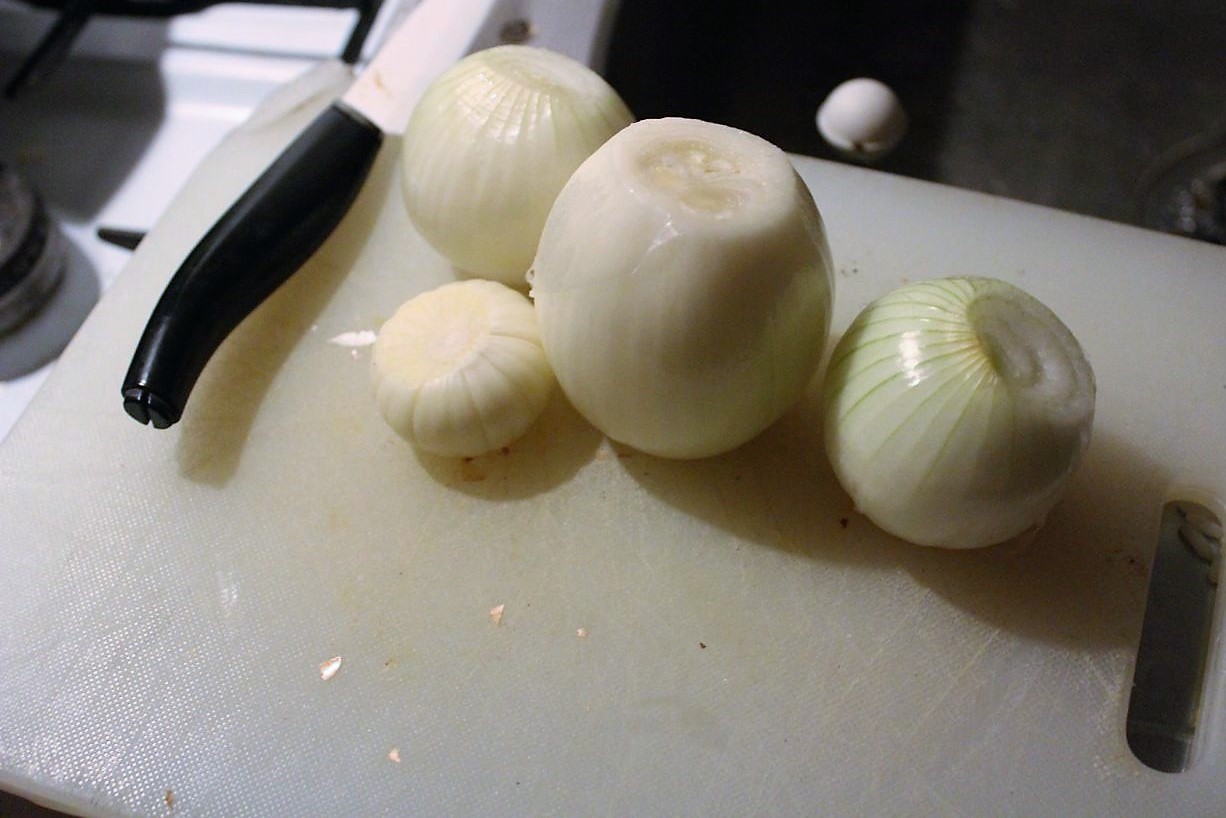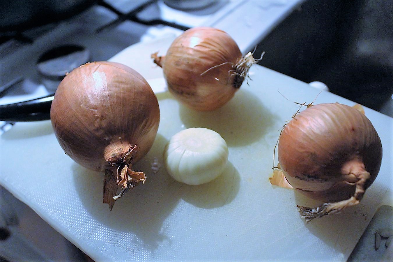 Zwiebeln halbieren, oder grob zerkleinern, Knoblauch klein hacken.