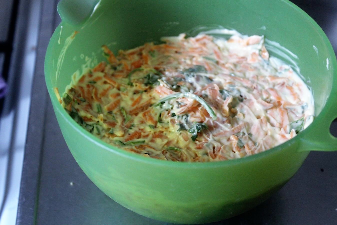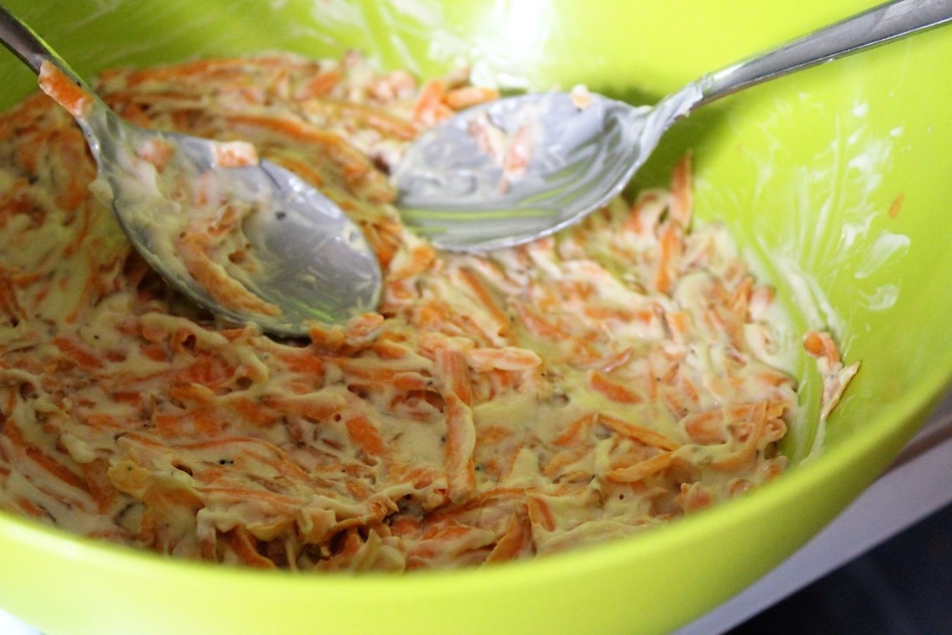 Möhren mit der Mayonnaise vermischen. Ich war nie so ein großer Möhrenfreund, aber auf das Rezept bin ich total gespannt.