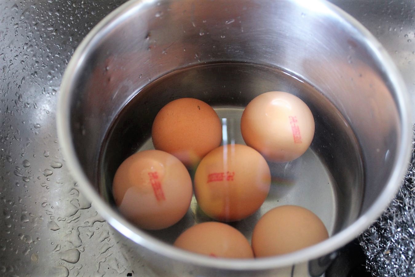 Eier in Scheiben schneiden und zusammen mit dem Blattsalat auf einer Platte anrichten.