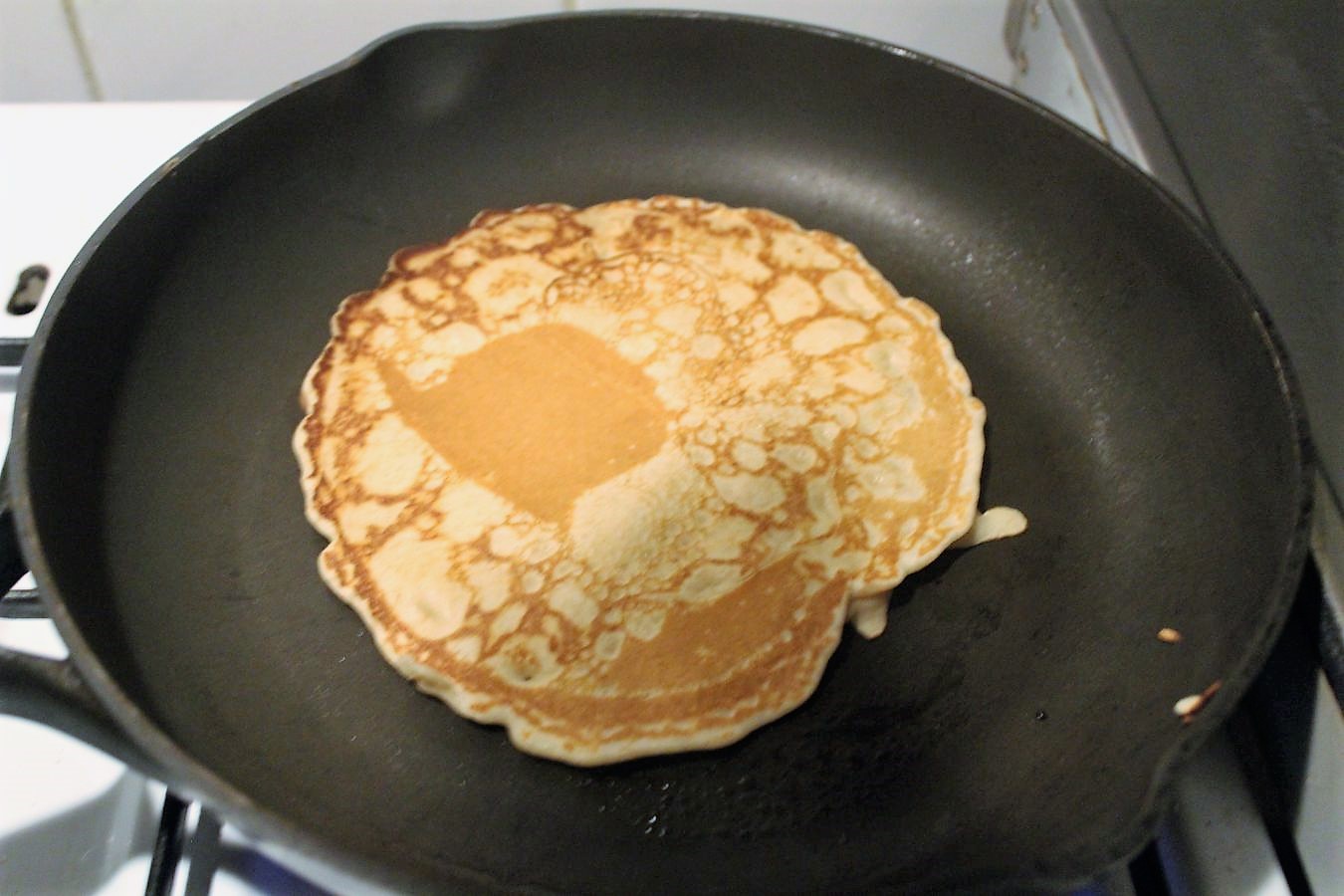 Pfannkuchen wenden, wenn der Pfannkuchen auf der Oberseite schon so trocken ist, dass keine Flüssigkeit beim Wenden runterlaufen würde. Wenn die Rückseite dann zu dunkel ist, dann arbeitet Ihr mit zu großer Hitze. Ich rechne bei Pfannkuchen immer mit einem Probepfannkuchen, bis man weiß, wie heiß die Pfanne sein muss und wie lange das pro Seite dauert. Das solltet Ihr auch machen und ich lande bei mittlerer Hitze