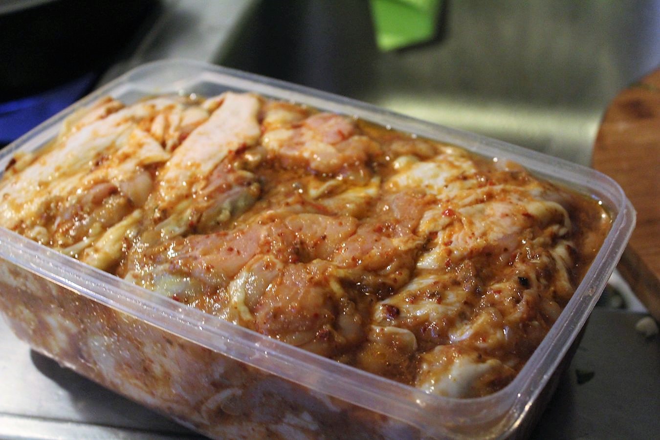 Fleisch in eine Gefrierdose packen und im Kühlschrank marinieren lassen. Optimal ist, wenn man das Fleisch mindestens einen Tag marinieren lässt, noch besser wird es, wenn man mehr als einen Tag Zeit gibt. Wenn man das spontan zubereiten will, geht es auch ohne Wartezeit, bevor man sich irgendeinen fertig marinierten Scheiß aus dem Supermarkt kauft. Die Zeit für das Marinieren, rechne ich jetzt nicht mit zur Zubereitung. Schnell ist das, was später in der Pfanne passiert.