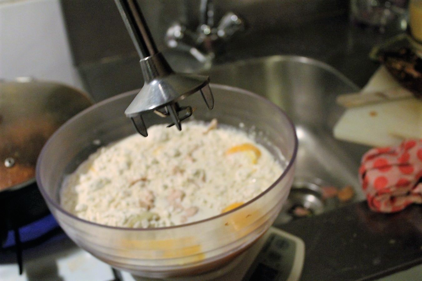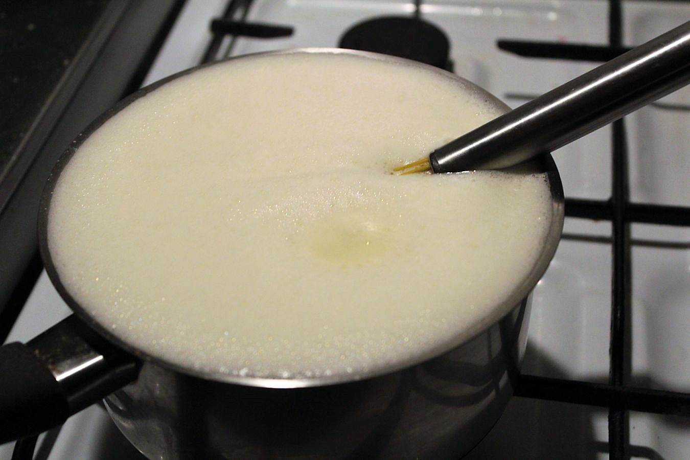 Jetzt die Milch einfach aufkochen und die ganze Zeit in Bewegung halten. Dafür kann man einen Schneebesen nehmen, oder einen Handrührer. Ich nehme meinen Esge Zauberstab.