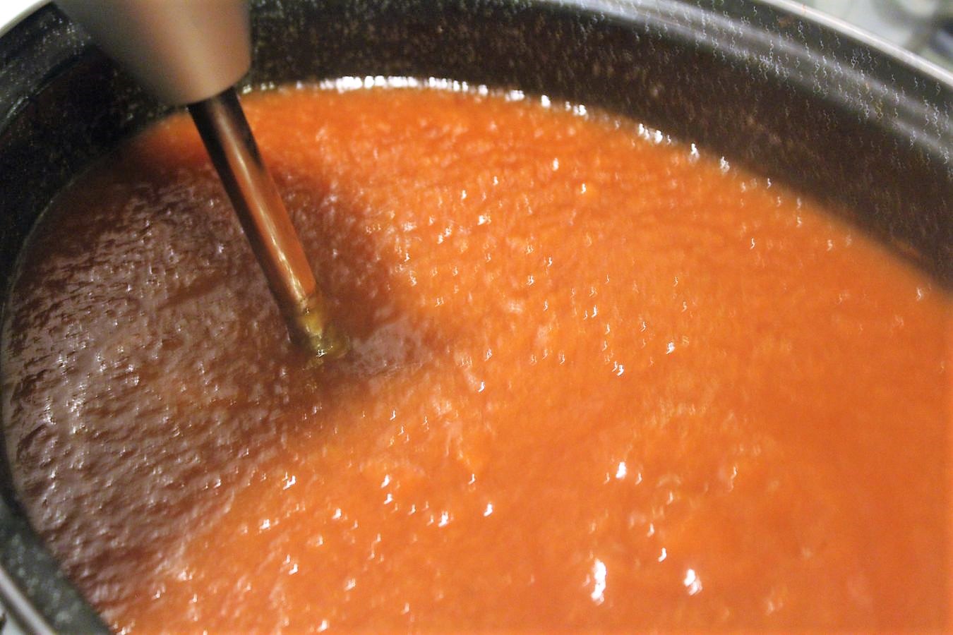 Auf dem Herd ca 12h kochen lassen auf kleiner Flamme. Dann sind etwa 60%des Volumens weg.