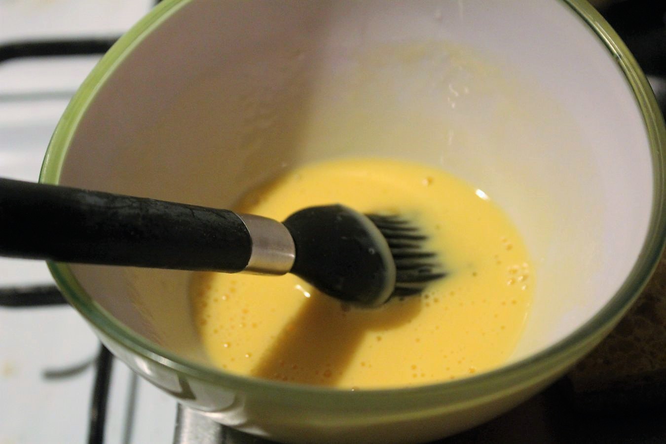 Die Milchbrötchen nach dem Wenden, mit dem Eigelbmilchgemisch bepinseln
