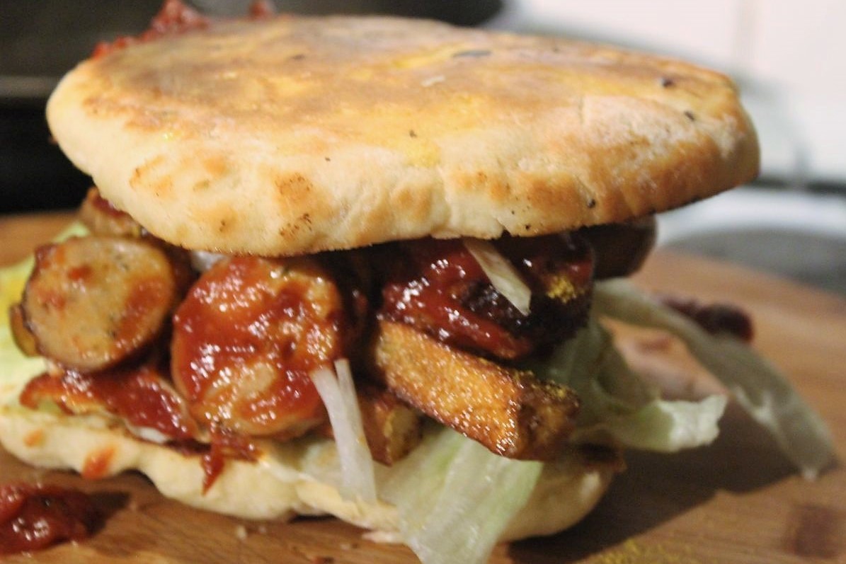 Und jetzt festhalten, mein Icke ditte Currywurst spezial Burger mit Pommes im Bun. Da fliegt die Kuh