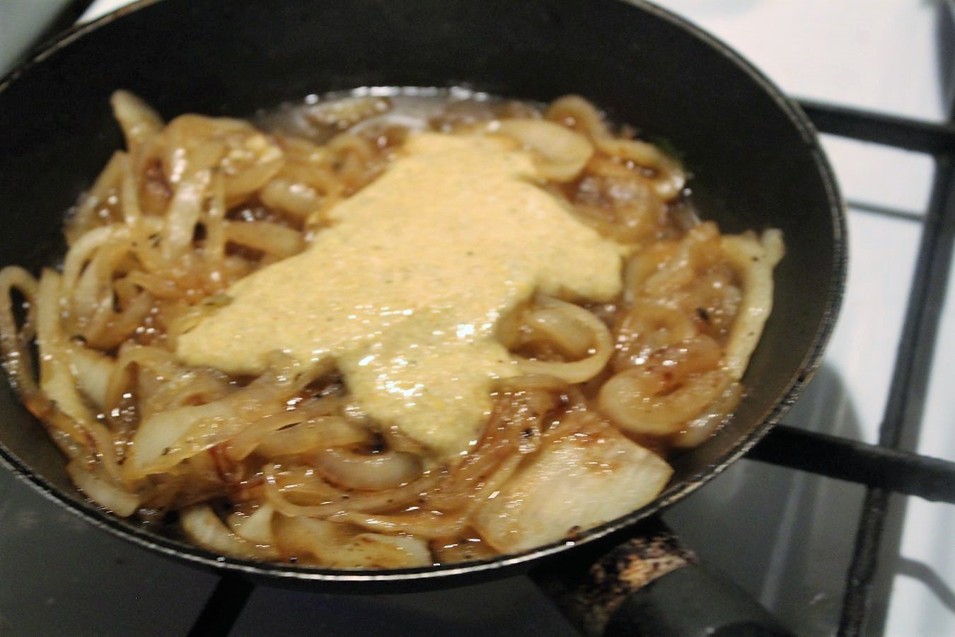 Jetzt noch einen guten Esslöffel vom Thüringer Senf zu den Bierzwiebeln geben.