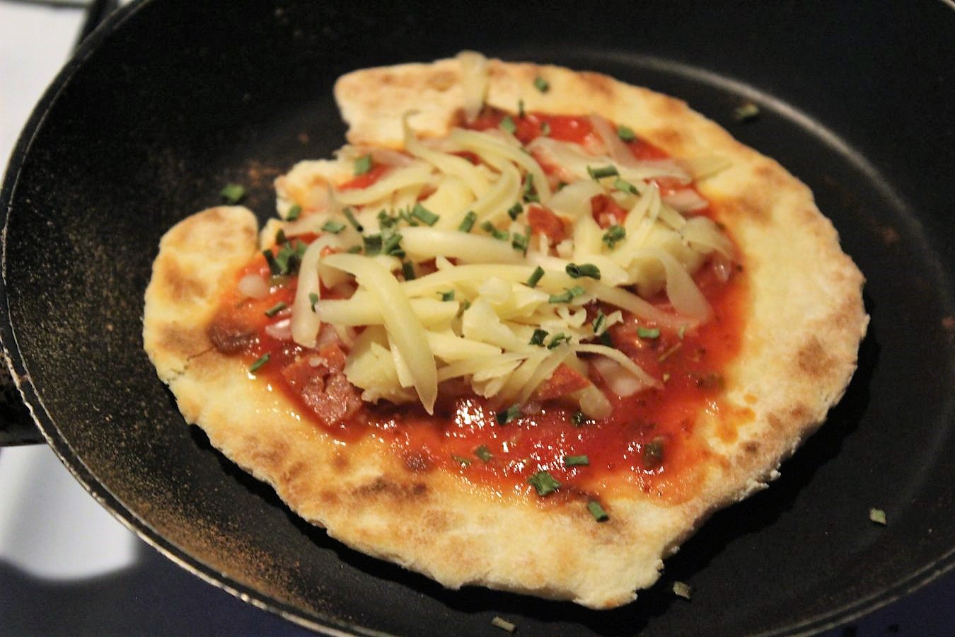 Jetzt haben wir alle Zutaten zusammen und wir starten mit dem Pizzabacken in der Pfanne.