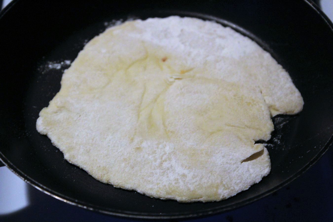 Wenn die Pfanne richtig heiß ist, kommt der ausgerollte Teig hinein