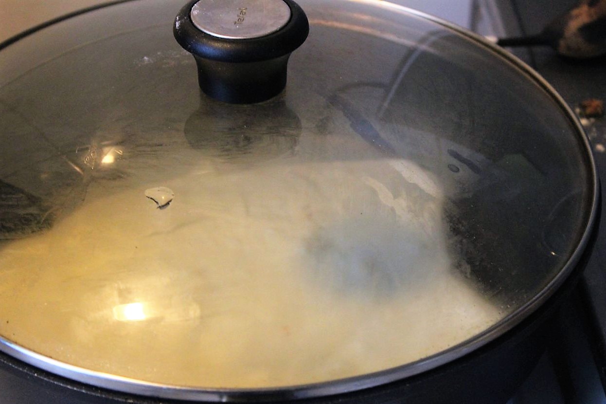 Deckel auf die Pfanne legen, das ist ganz wichtig, damit sich ein Wärmepolster in der Pfanne bildet