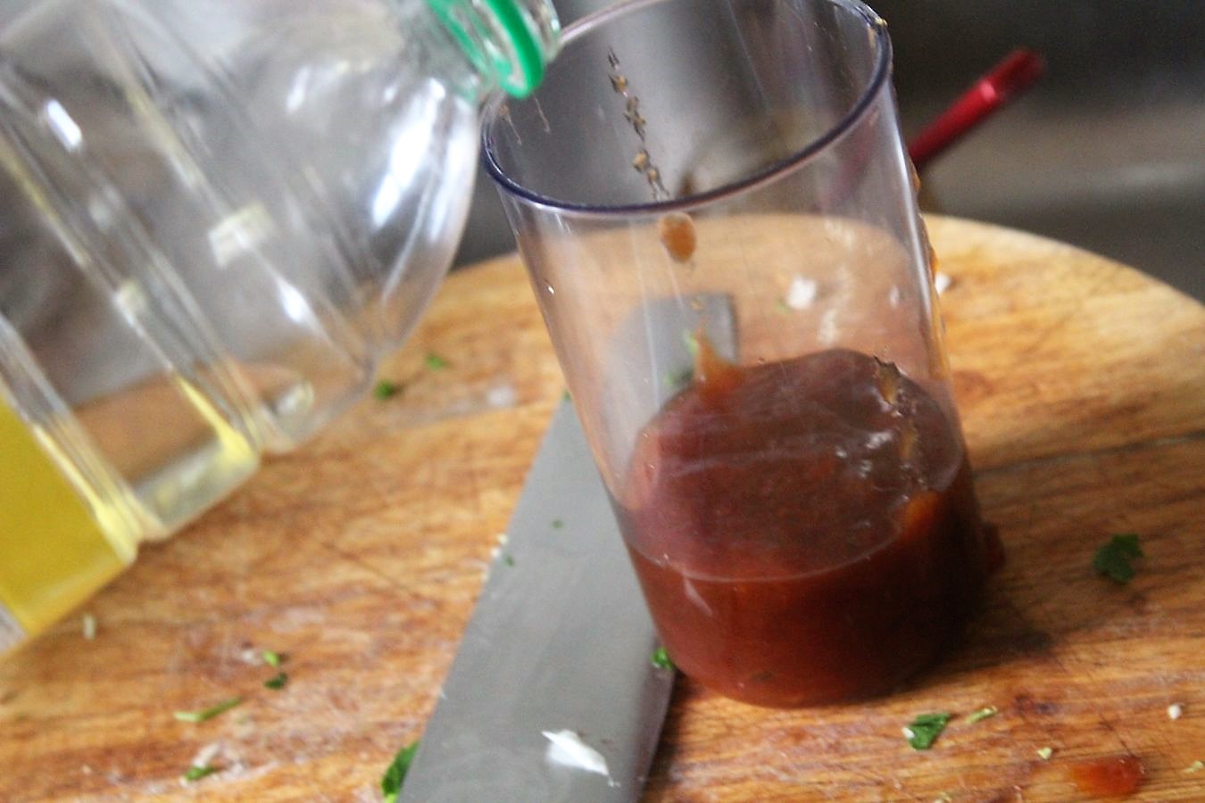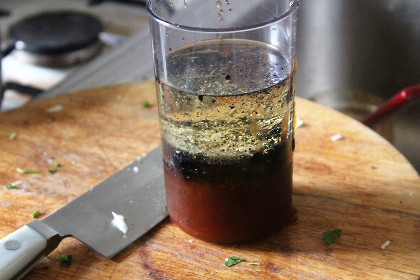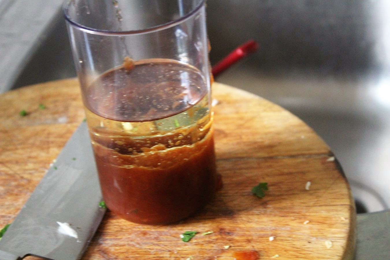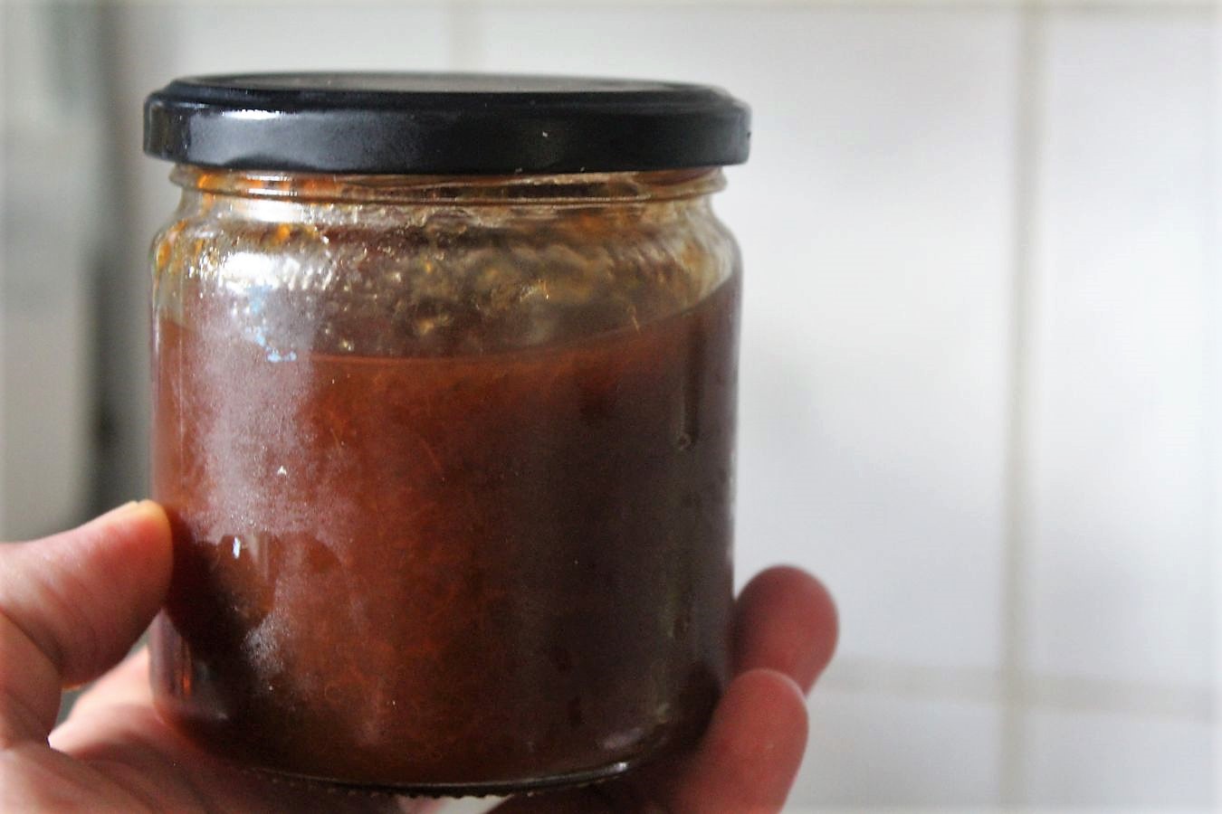 Ich nehme ein Glas Mirabellenmus, um das Fleisch kurz zu marinieren und auch für mein Salatdressing