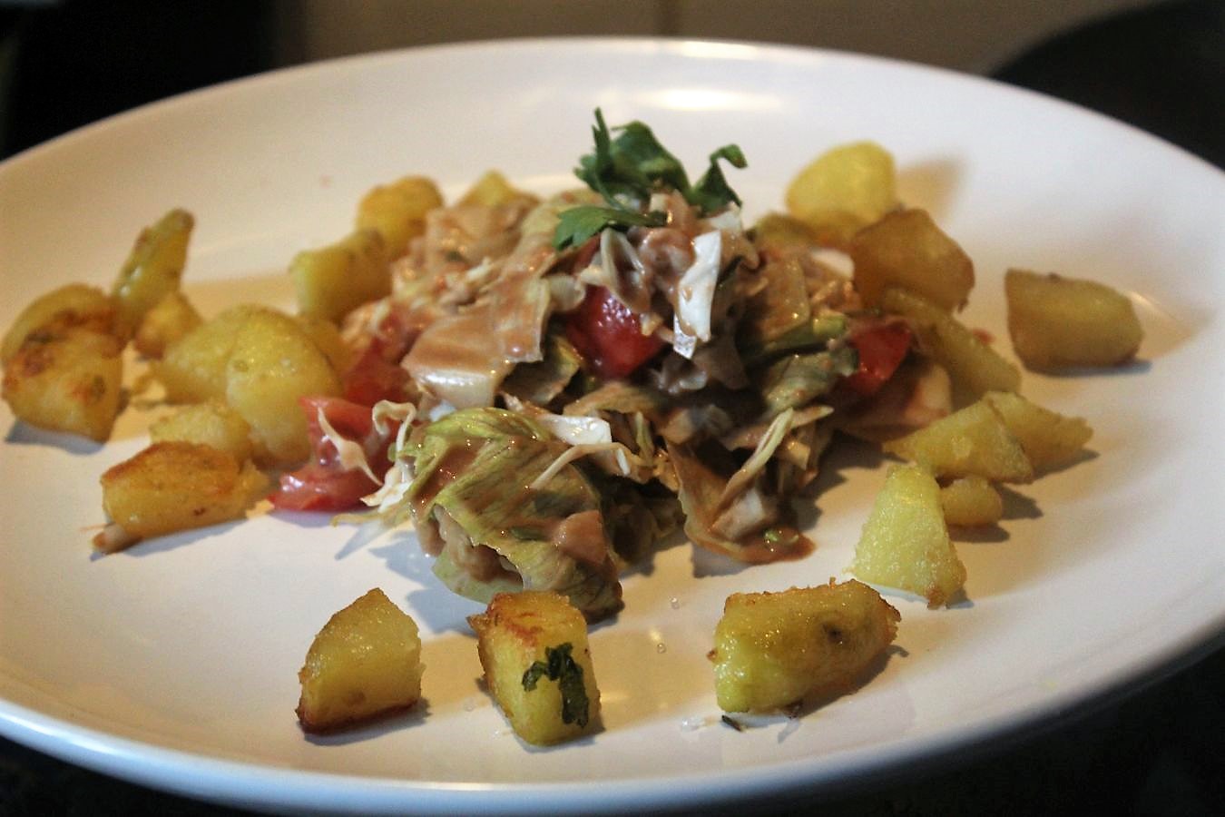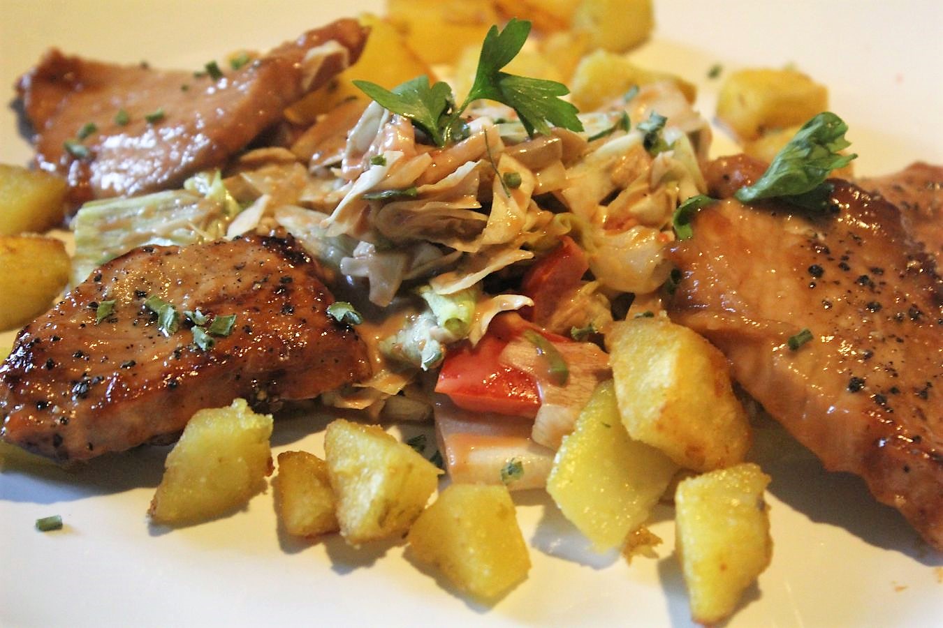 Oha, was lecker! Super zartes Fleisch, ein toller, fruchtiger frischer Salat, knusprige Kartoffelwürfel. Das ist eben gescheites Fleisch, ohne Knorr Salatkrönung, mit Liebe zubereitet.