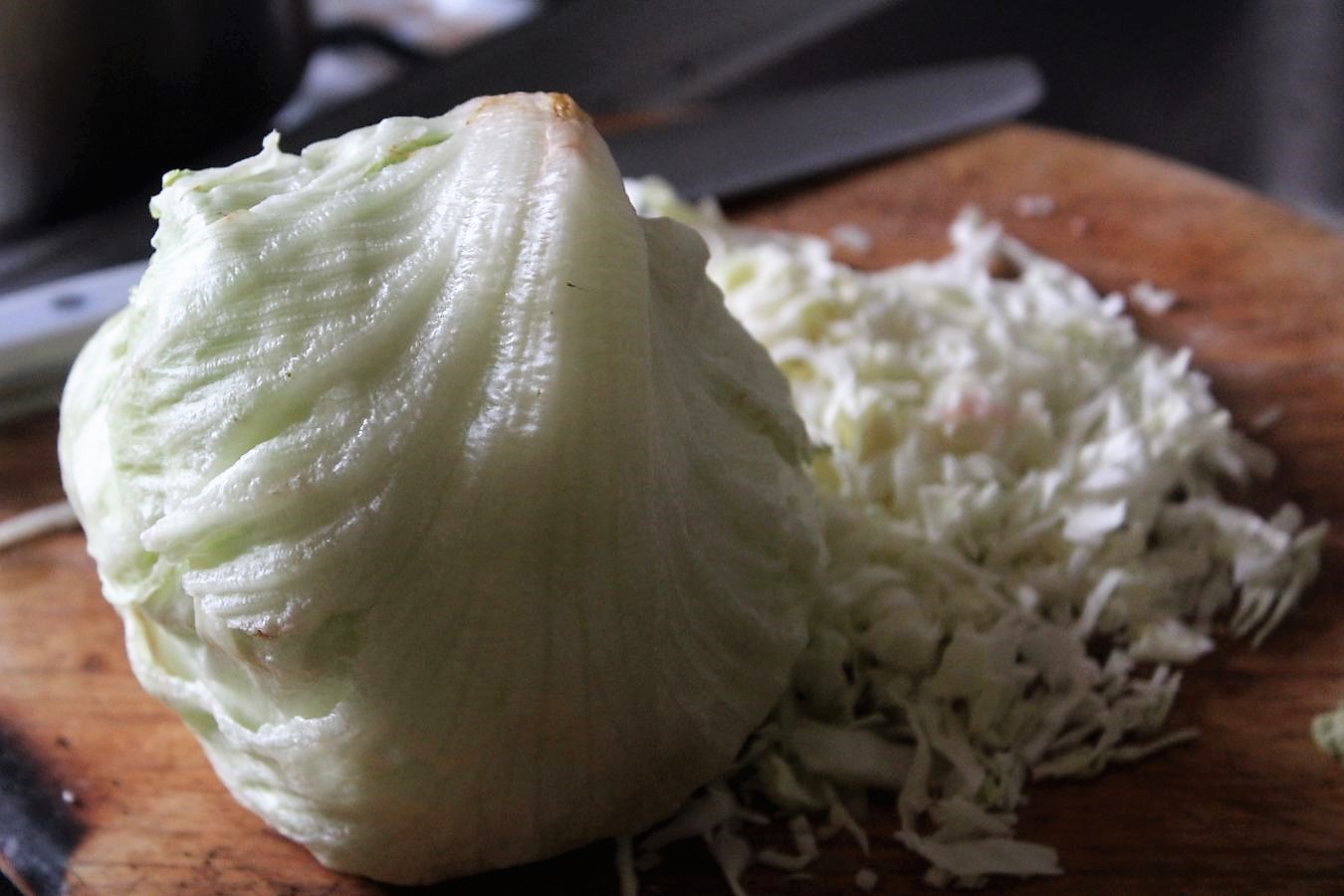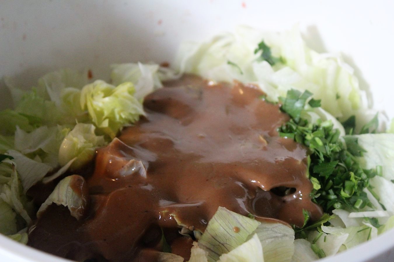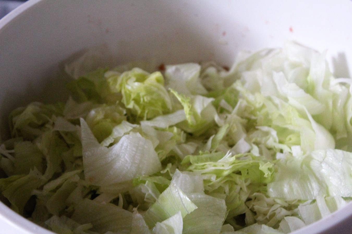 Das Fleisch lassen wir kurz ziehen, bis es in die Pfanne kommt, während wir jetzt schnell den Salat schneiden