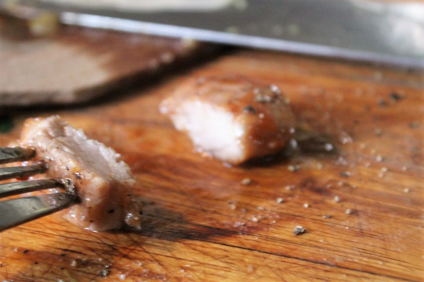 Es ist ganz durch, Fleischfaser gut definiert, aber super saftig und total zart. Erst jetzt wird mit Salz und Pfeffer aus der Mühle gewürzt.