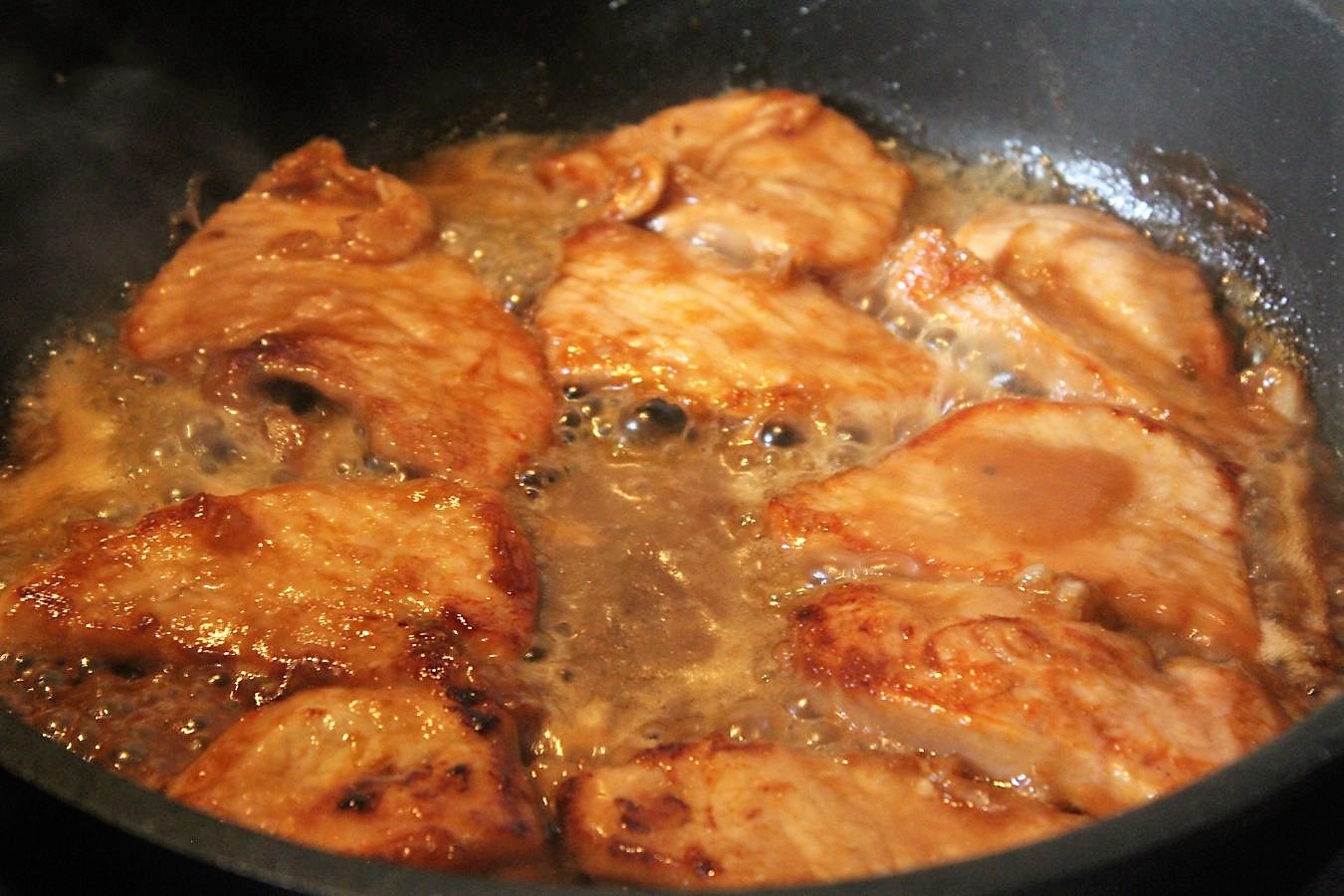 Die Mirabellenmusmarinade gibt erst Flüssigkeit ab und brät dann ganz schnell ein und wirkt wie ein karamellisierender Überzug am Fleisch.