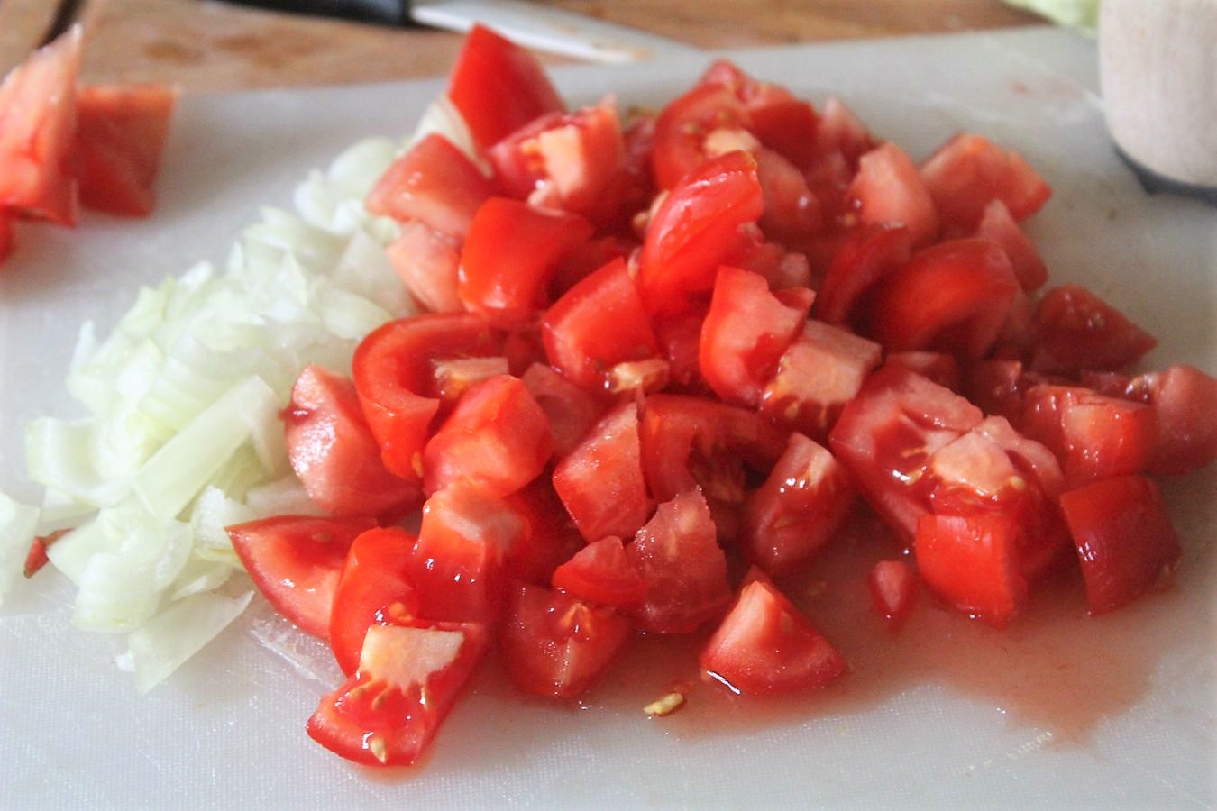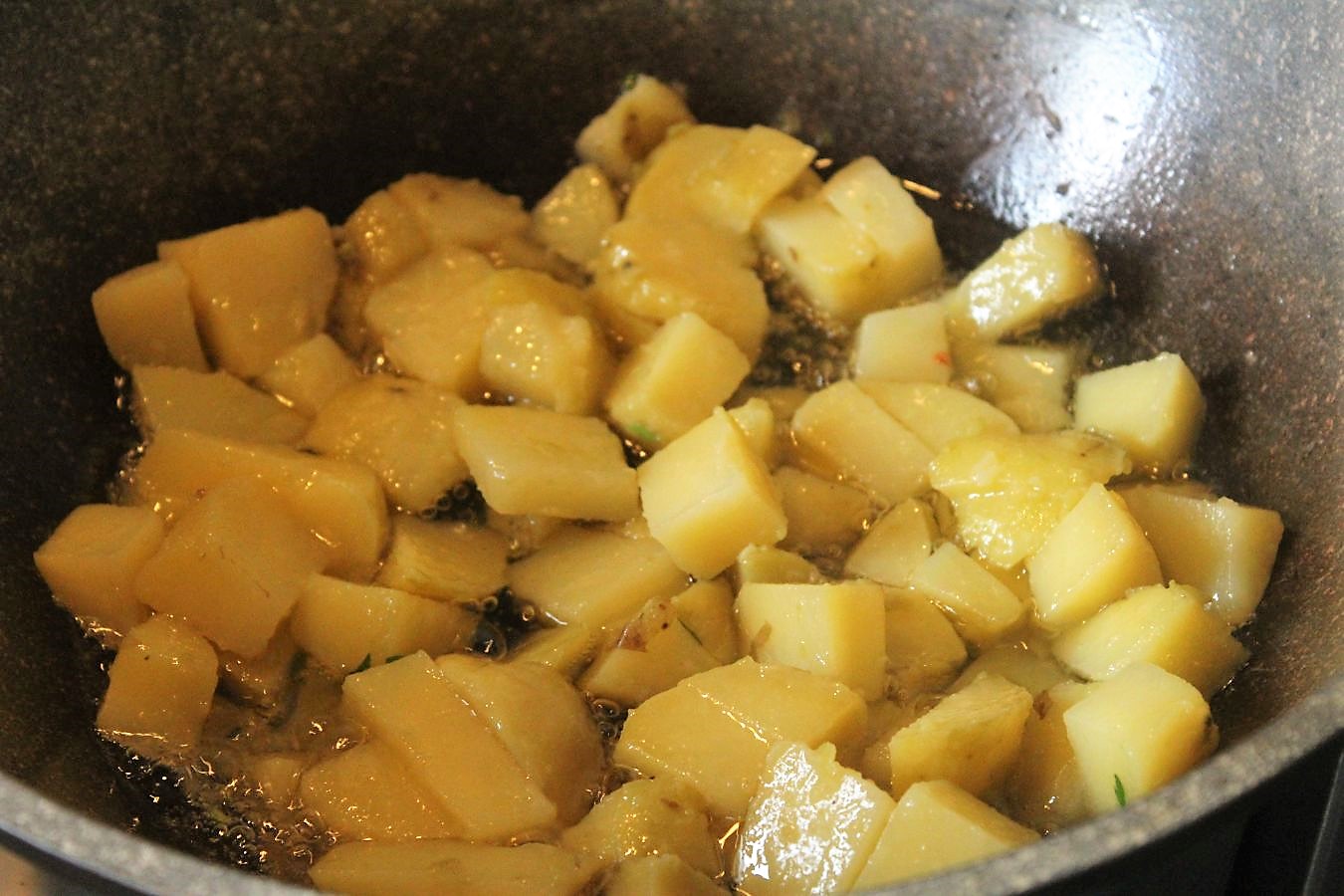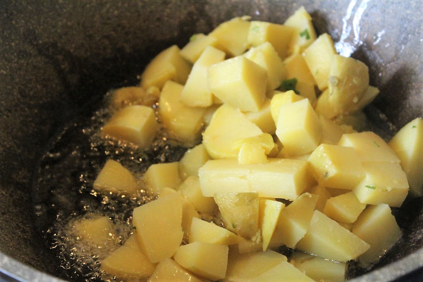 Ich hatte noch drei große Pellkartoffeln vom Vorabend fertig, die ich nur würfeln musste. Habe ich eigentlich meistens parat, weil immer irgendwer irgendwas gerade nicht essen will und der bekommt dann etwas aus den Kartoffeln gezaubert. Man kann auch rohe Kartoffeln verwenden, aber dann dauert es eben länger.