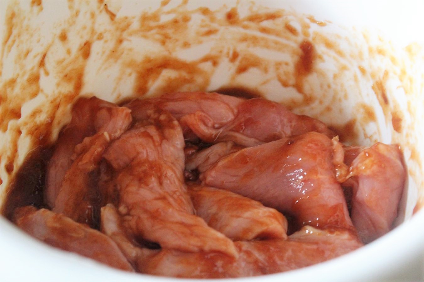 Das Fleisch in der Pfanne mit Salz und Pfeffer würzen. Hier kann man auch sehen, die sich die Marinade um das Fleisch gelegt hat.