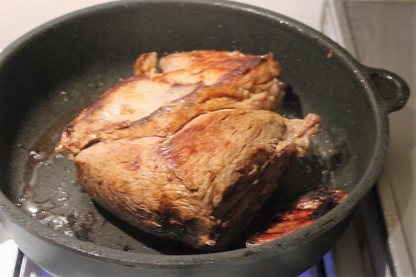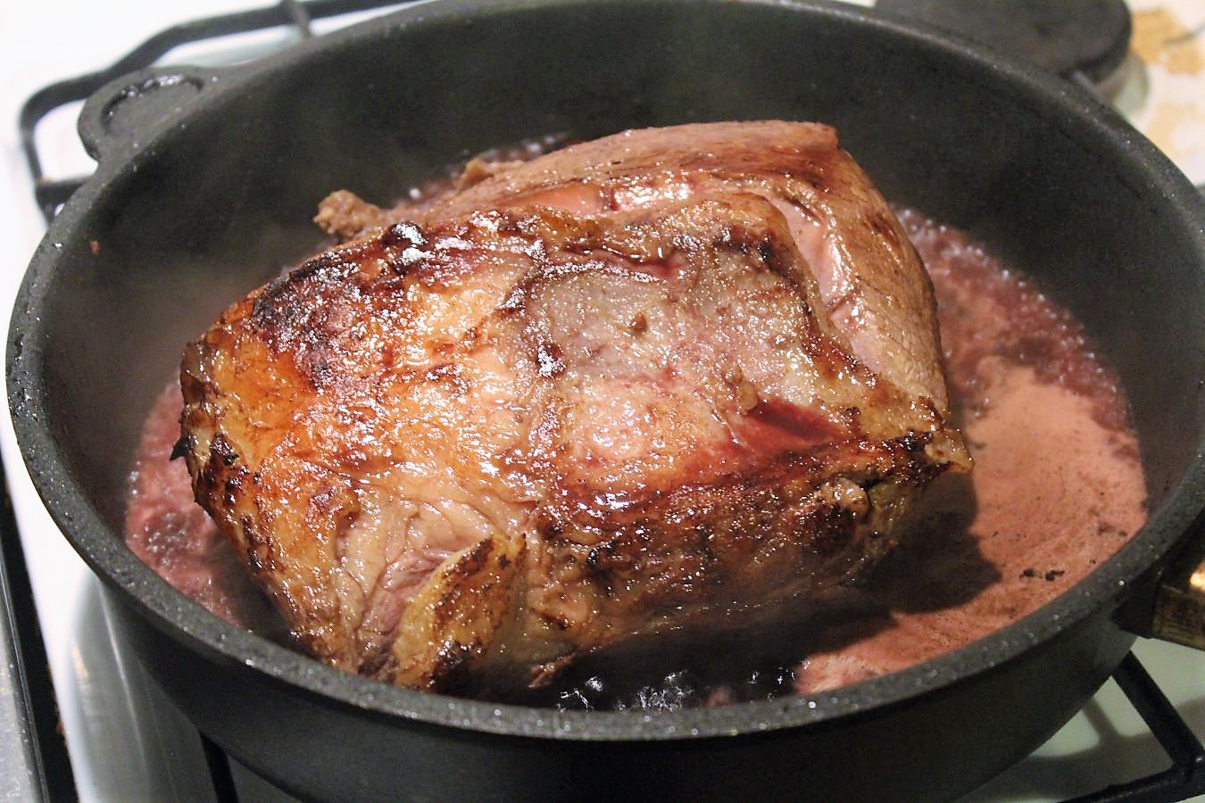 Deckel auf die Pfanne legen und dann das Fleisch alle halbe Stunde umdrehen.