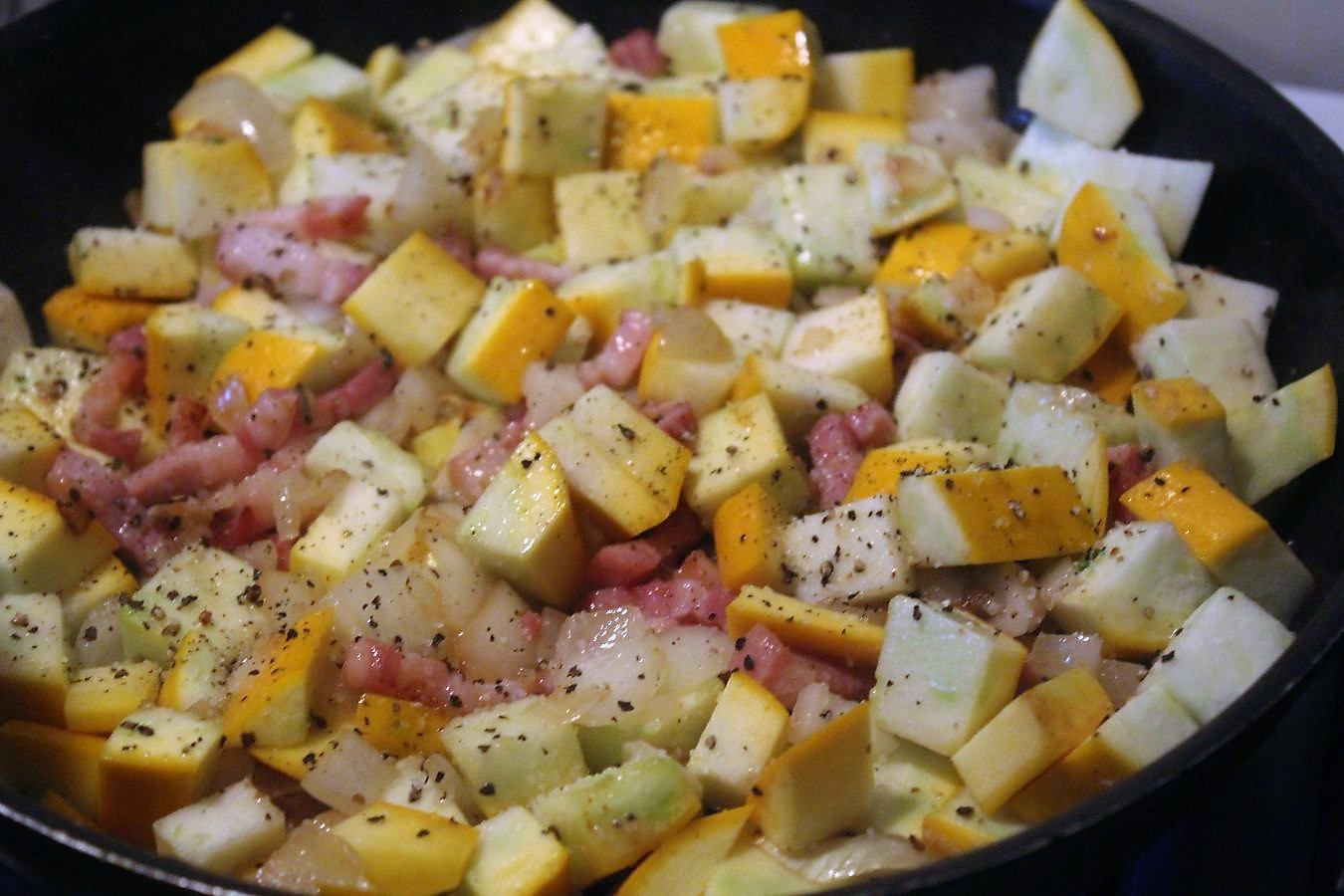 Zucchini zum Bacon, Zwiebeln und dem Knoblauch in die Pfanne legen, mit Salz, Pfeffer und einer Prise Zucker würzen.