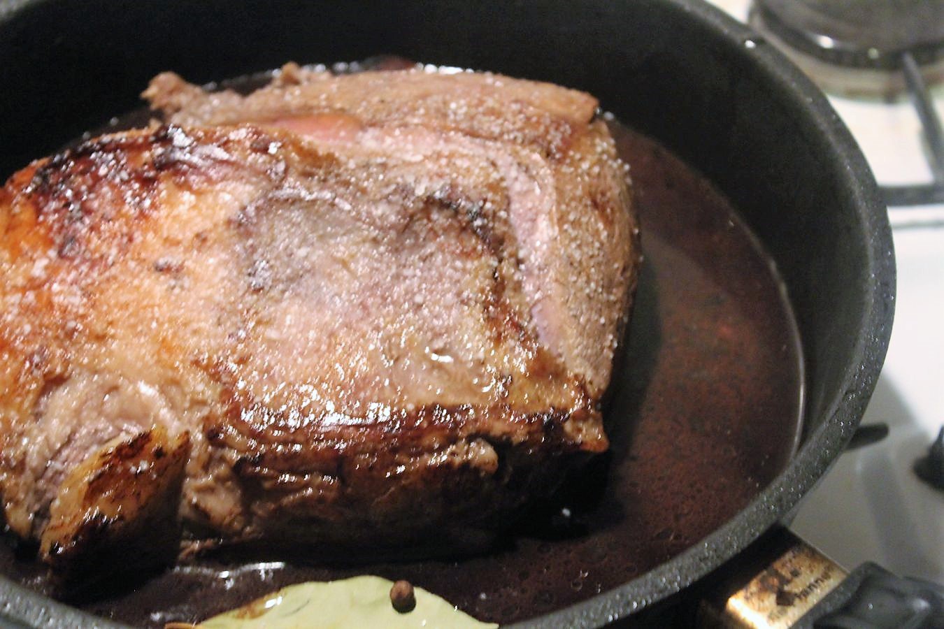 Hier ist meine selbst gemachte Brühe. Die Flüssigkeit soll ungefähr halb so hoch in der Pfanne stehen, wie der Braten hoch ist. Dann gart das Fleisch gleichmäßig, wenn man es alle halbe Stunde umdreht.