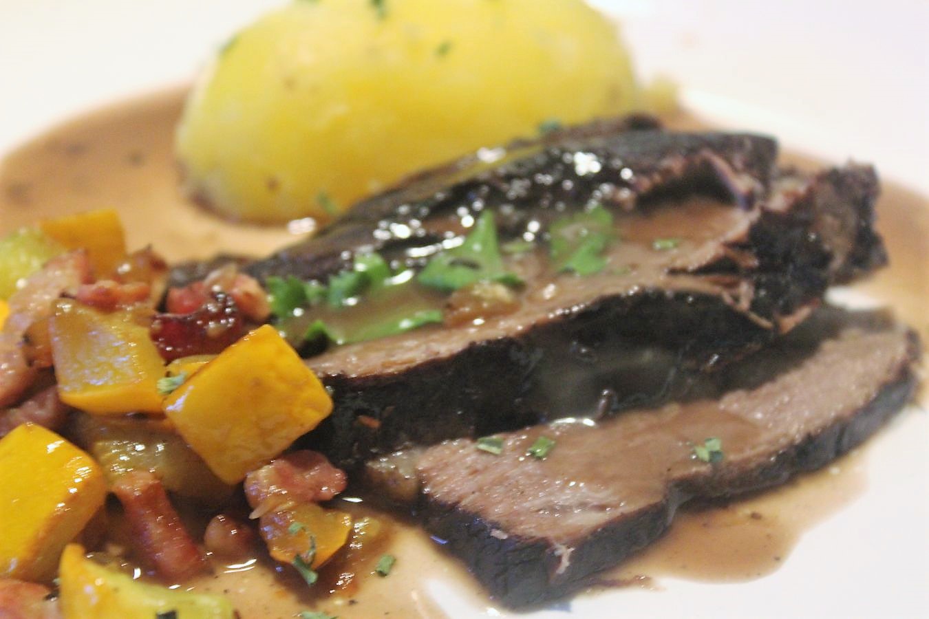 Nach zwei Stunden ist das Fleisch perfekt gegart und zart wie Butter. Man könnte es dann sofort essen, oder am Abend vorher schon für den nächsten Tag vorbereiten. Wenn man es nicht gleich serviert, muss man es an dem Tag, wenn man es isst, nur eine Stunde wieder auf der niedrigsten Stufe, auf der kleinsten Platte erwärmen und nach einer halben Stunde umdrehen. Danach weiß keiner, dass es nur angewärmt ist.