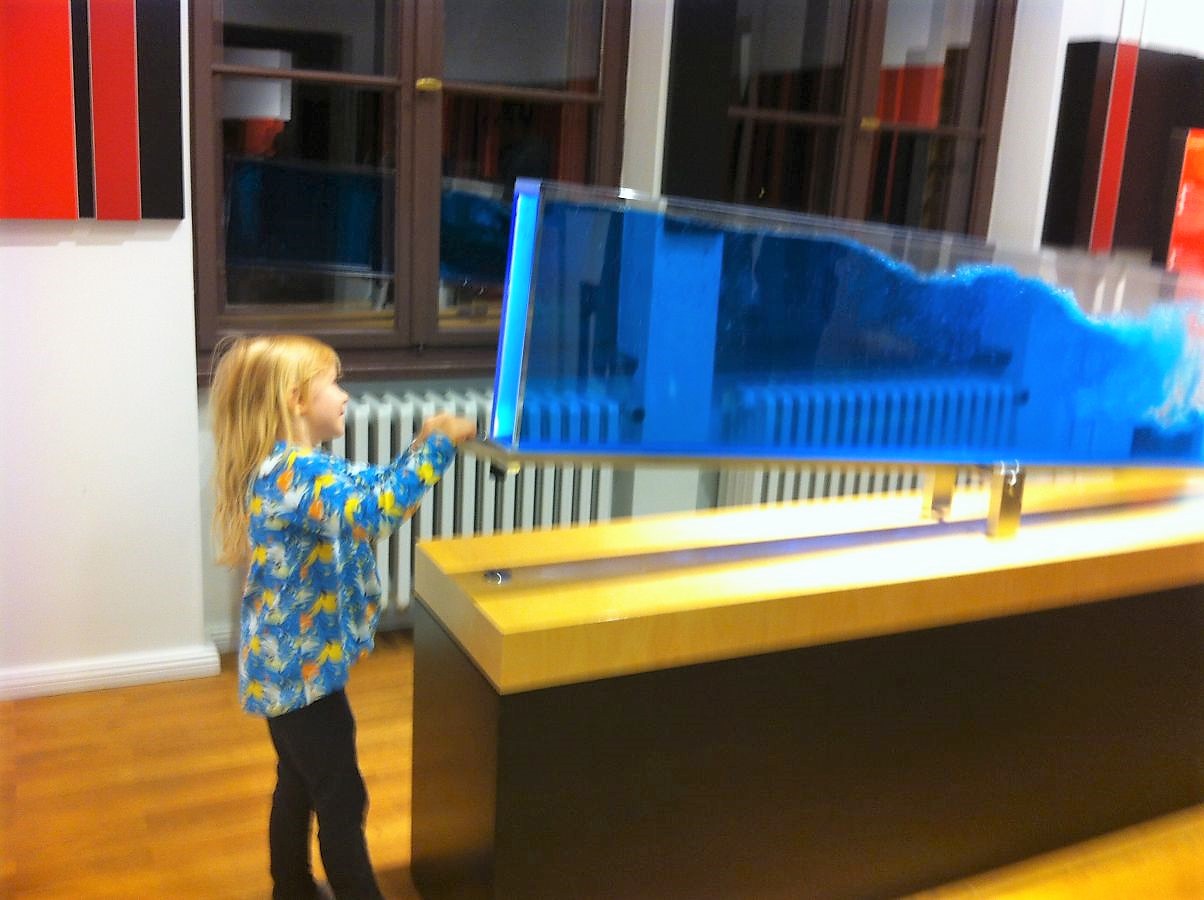 Hier noch ein paar Impressionen aus dem Technikmuseum. Da wird in verschiedenen Geschossen unter anderem sehr anschaulich Optik, Physik, Klang erklärt. Friedrich stellt hier gerade fest, dass die größten Formen nicht automatisch die schwersten sein müssen.