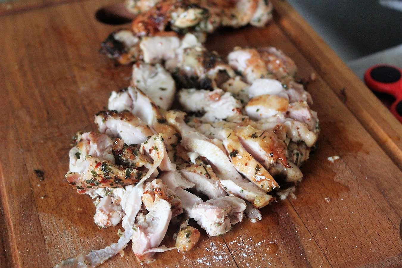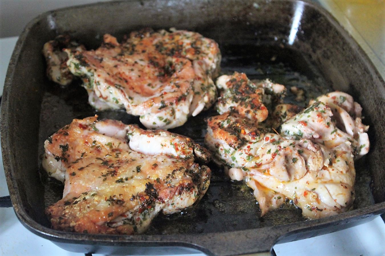Danach die andere Seite des Huhns ebenfalls 6 Minuten braten. Ich habe keine Zeit das Fleisch noch im Ofen gehen zu lassen, wie ich das bei einem Tellergericht machen würde, deswegen, gebe ich pro Seite eine Minute extra. Sonst brate ich immer nur 5 Minuten pro Seite.