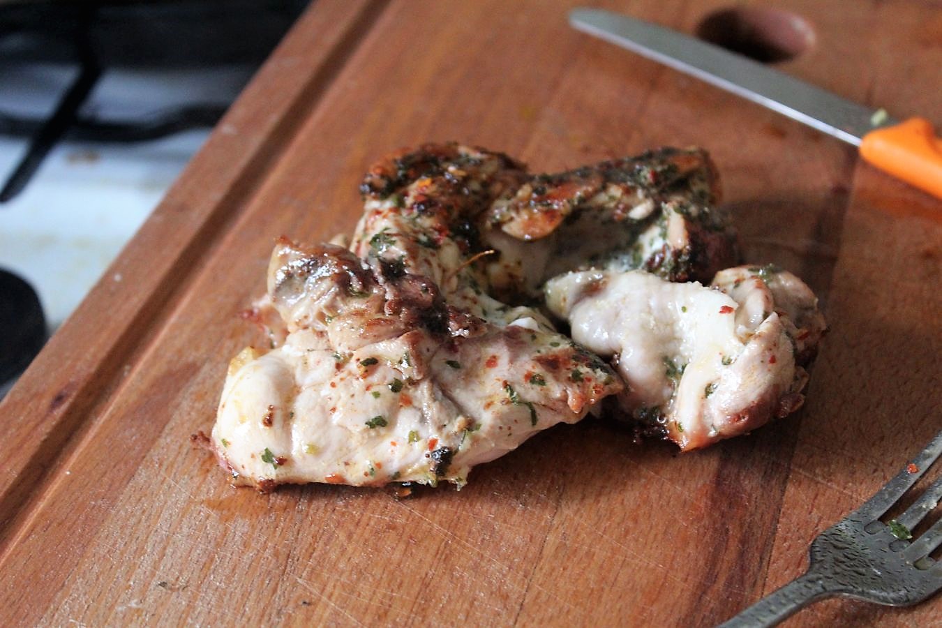 Das Fleisch habe ich schon in der Woche total ergebnisoffen eingelegt und nur auf eine günstige Gelegenheit gewartet, bei der ich das verbrauchen kann. Chiliflocken, den Saft einer Zitrone, Olivenöl oder Pflanzenöl, mehr braucht man gar nicht. Salz und Pfeffer gebe ich erst nach dem Braten an das Fleisch. Das mit dem Einlegen mache ich grundsätzlich so, wenn ich am Wochenende Fleisch kaufe, das nicht eingeschweißt ist, bzw. kein Haltbarkeitsdatum drauf steht, dass ich es am Montag einlege, damit es nicht schlecht wird, falls es bis dahin nicht verbraucht ist. dann hält es im Kühlschrank deutlich länger und schmeckt jeden Tag noch besser als vorher.