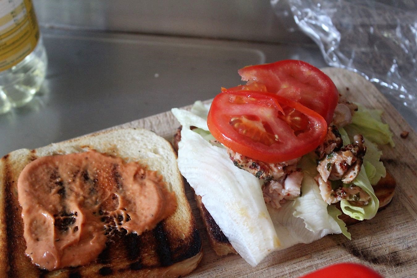 Fertig ist das Sandwich. Sehr geil! Knuspriger Toast, super zartes und würziges Huhn, tolles Dressing und knackiges Gemüse. Besser als unterwegs irgendwas teures aus der Fertigfutterhölle zu kaufen