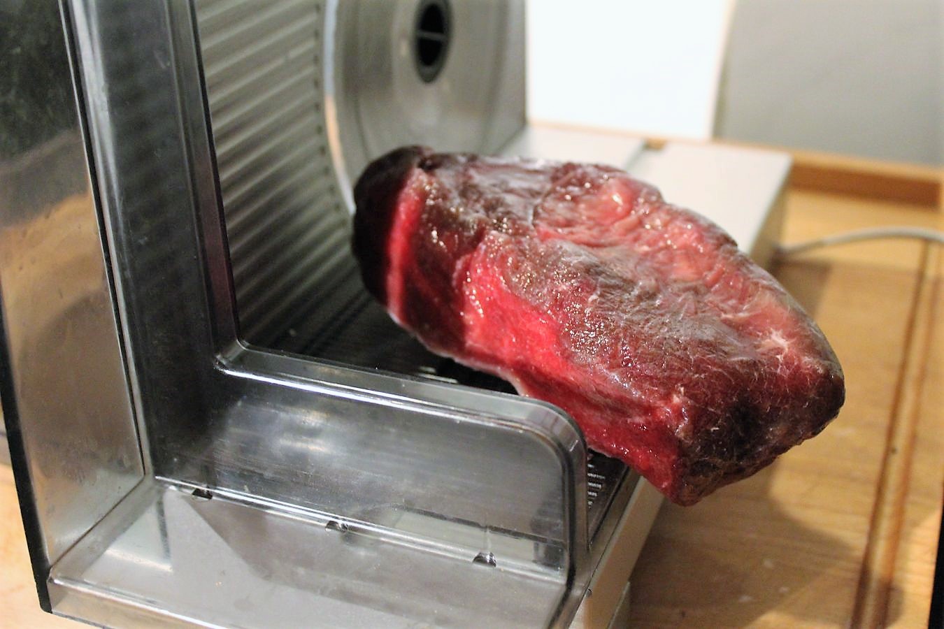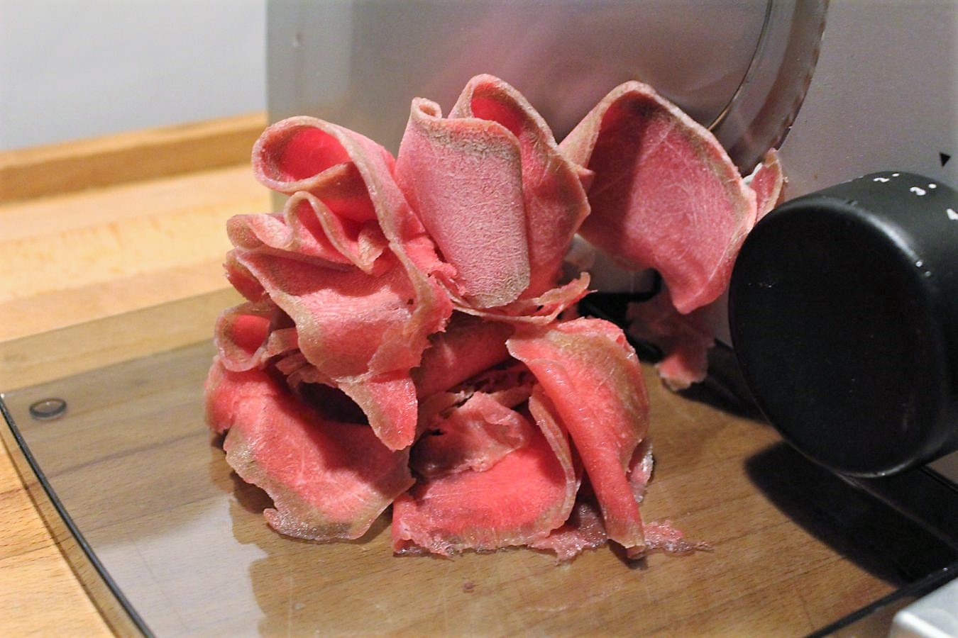 Die Maschine auf 1,5 bis 2 Milliliter einstellen und danach das gefrorene Roastbeef, durch den Allesschneider jagen. Dann ist das Fleisch gleich so dünn, dass man es nicht mehr plattieren muss. Wenn man es nicht so stark durch das Messer drückt, wird die Dünne noch geringer und eigentlich will man das Fleisch ja so dünn haben, dass man dadurch Zeitung lesen könnte.