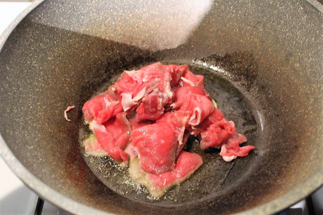 Das Fleisch ist noch gefroren, aber so dünn geschnitten, dass es ganz schnell wieder aufgetaut ist.