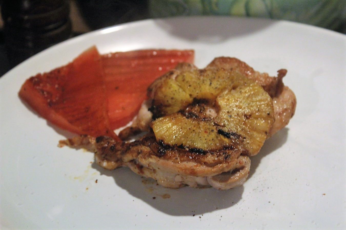 Fleisch auf den Teller legen, mit Ananasscheiben bedecken, von der gegrillten Melone ebenfalls nach Lust und Laune auf dem Teller drapieren. Über das Fleisch noch Salz und Pfeffer aus der Mühle geben. Das ist bislang nur mariniert, braucht deswegen auch nicht mehr viel Gewürz, nur noch eine Prise.