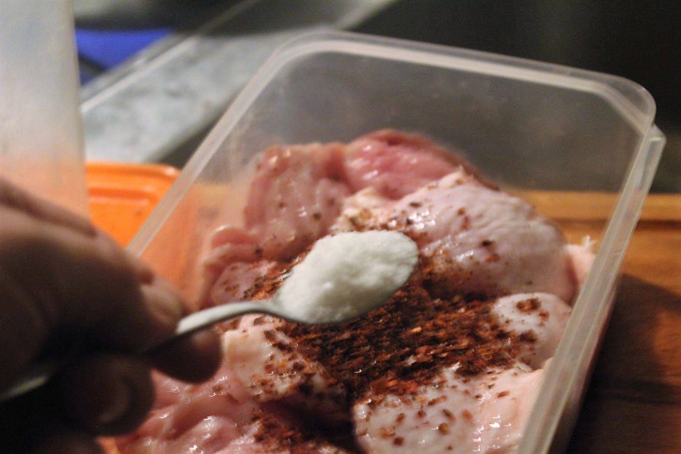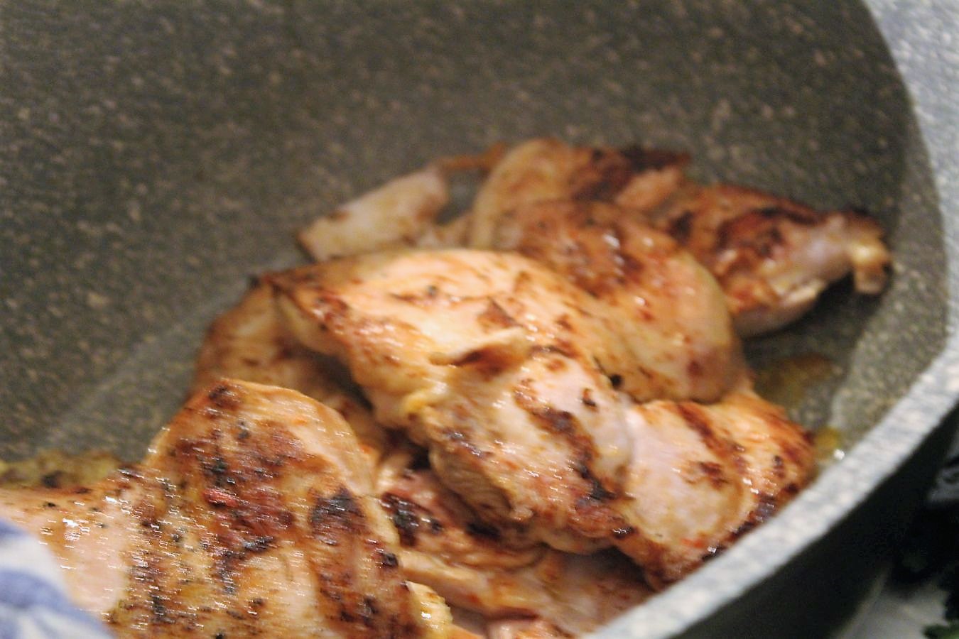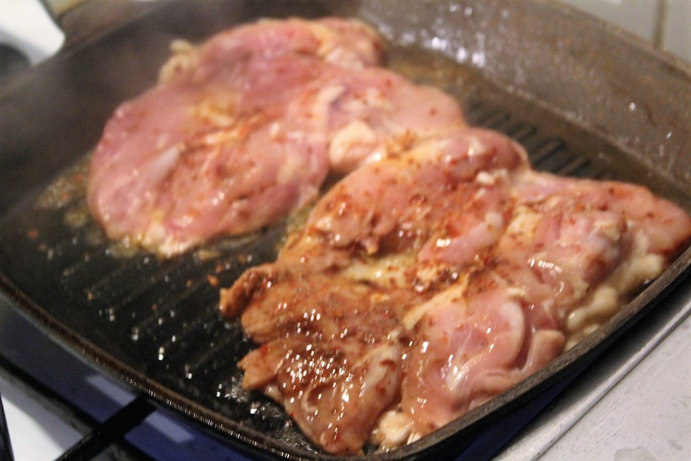 Ich habe entbeinte Hähnchenkeulen gekauft. Das ist dann das Fleisch ohne Knochen, aber mit Haut. Das ist mit Abstand das saftigsten Stück vom Huhn, wenn man es auf der Haut brät. Ich weiß, viele behaupten von sich das nicht mit der Haut zu mögen, aber noch mehr werden das sicherlich so noch nie probiert haben und das wäre eine gute Gelegenheit, sich vom Gegenteil überzeugen zu lassen.