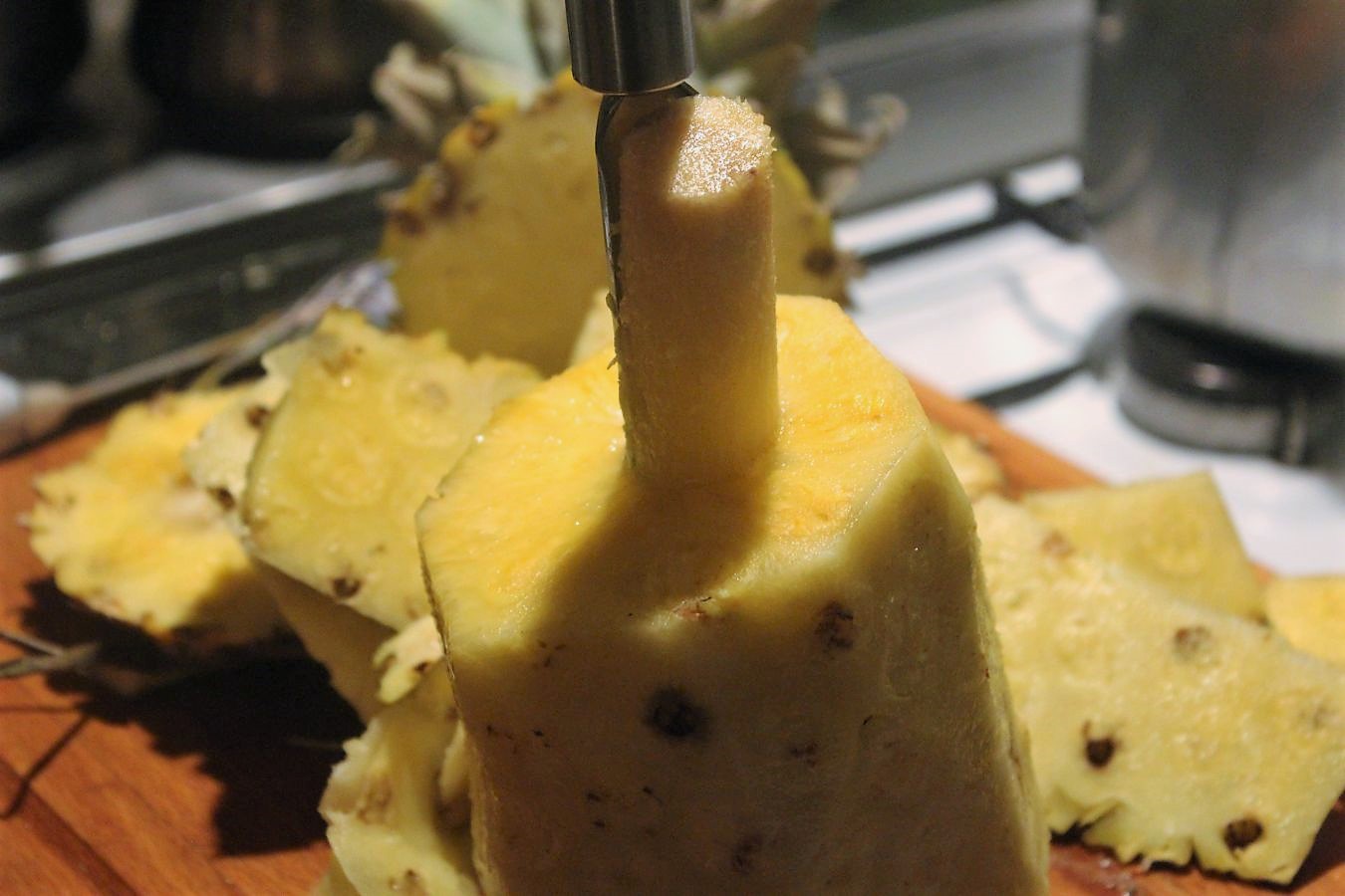 Ich habe mir so ein Dekoset für Früchte bei Lidl für 3,99 Euro gekauft. Da ist so ein Kernbohrer für Apfelgehäuse dabei. Damit kann man auch den harten Kern aus eine Ananas befreien
