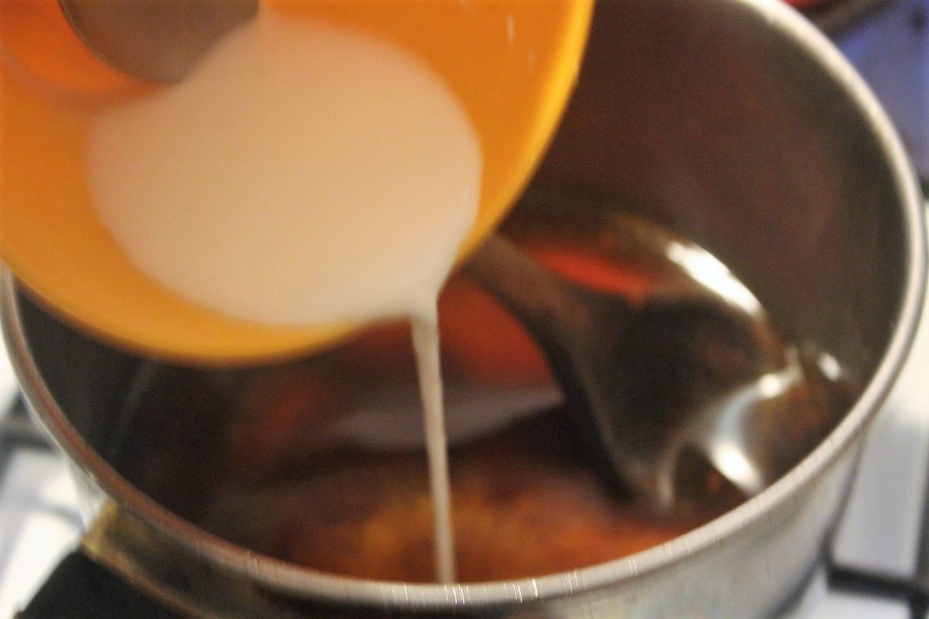 Speisestärke unter ständigem Rühren in die Soße gießen.