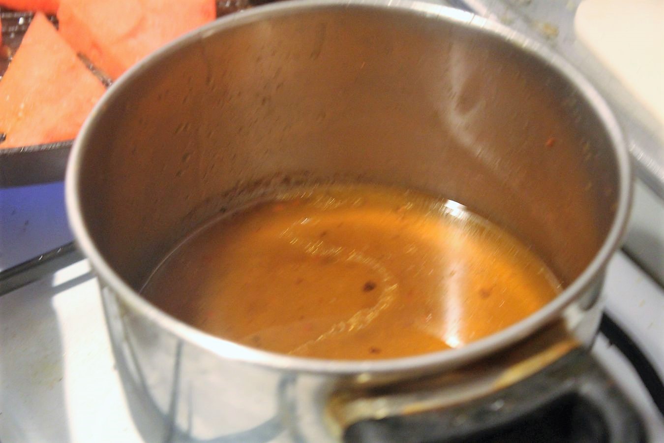 300 Milliliter Brühe, die Flüssigkeit die sich im Bräter im Ofen gesammelt hat, ein paar Tropfen von der Marinade aus der Gefrierdose (mehr war es leider nicht) Herd auf Vollgas stellen