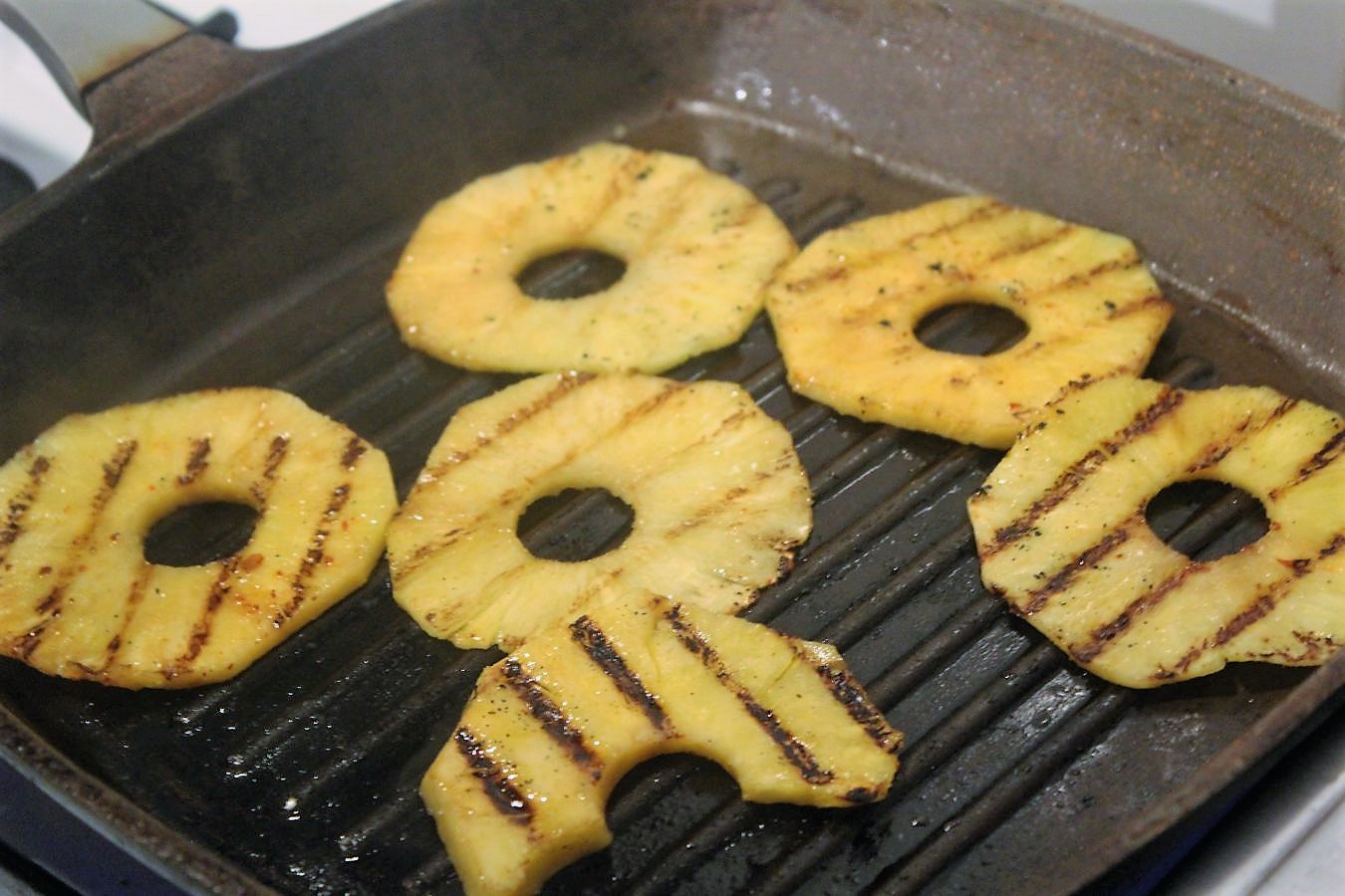 Wenn Ihr den Herd anstellt, könnt Ihr gleichzeitig den Ofen anstellen, aber nur so um die 80 Grad, damit das was Ihr später warm halten möchtet weiter zieht, aber nicht mehr massiv nachgart. Herd volle Pulle anstellen. Ananas drei Minuten pro Seite.