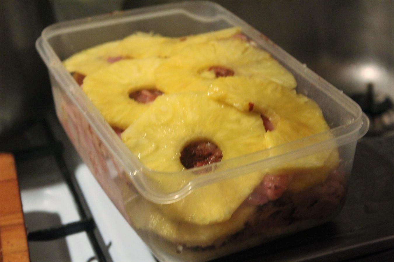 In einer Gefrierdose abwechselnd Ananasscheiben und Fleisch stapeln