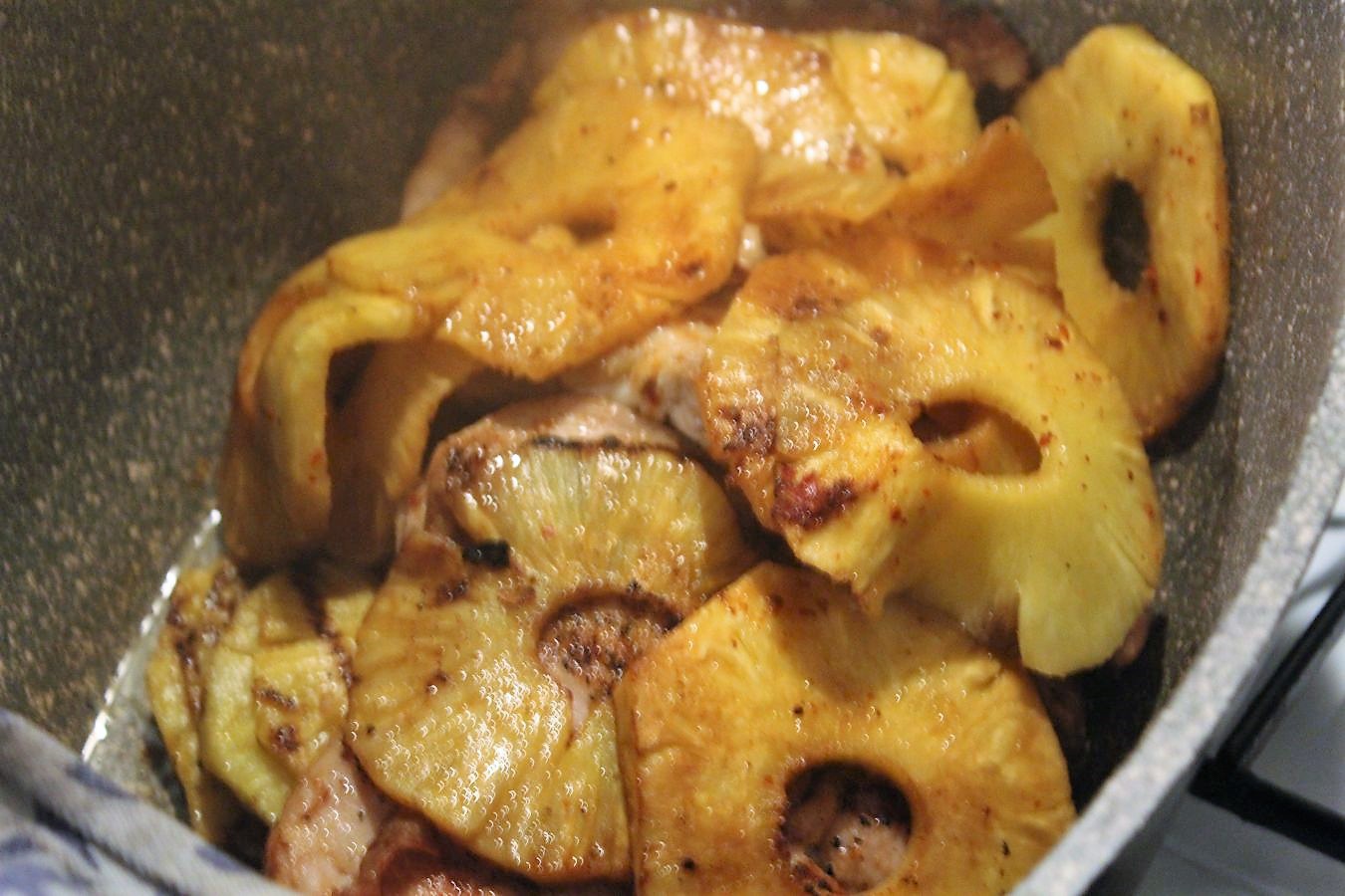 Alles was fertig aus der Pfanne kommt, egal ob es Ananas, oder Fleisch ist, kommt in meinen Bräter und wird mit Deckel bei 80 Grad im Ofen zwischengelagert. Da zieht es schonend weiter gar. Das Fleisch wäre jetzt innen noch leicht medium, was natürlich kein erstrebenswerter Gargrad für Huhn ist.