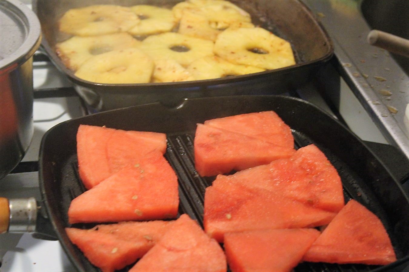 Dann kommt noch eine Lage Ananas in die Pfanne und in der zweiten Pfanne wird die Melone “gegrillt”