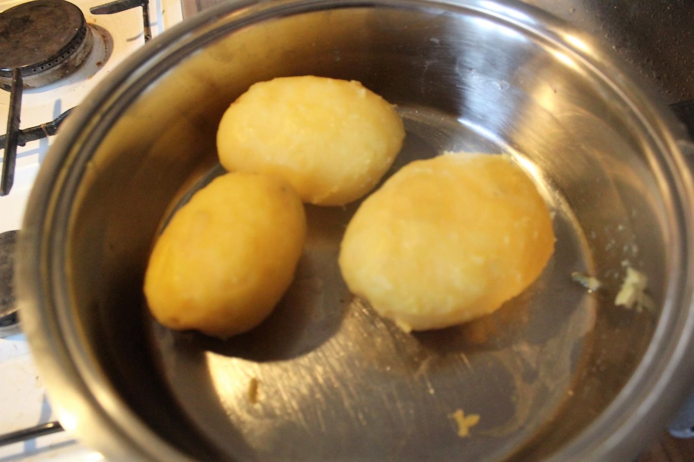 Das ist ein Topf voller Pellkartoffeln. Sowas muss ich regelmäßig für meine Familie kochen. Entweder gehören die zum Gericht des Tages, oder sie sind die Notfallküche, wenn wieder einer der vier Kinderkandidaten, über Nacht plötzlich noch nie Nudeln mochte. Kurz gesagt, es schadet nie ein paar Pellkartoffeln fertig stehen zu haben, weil immer irgendwas ist.