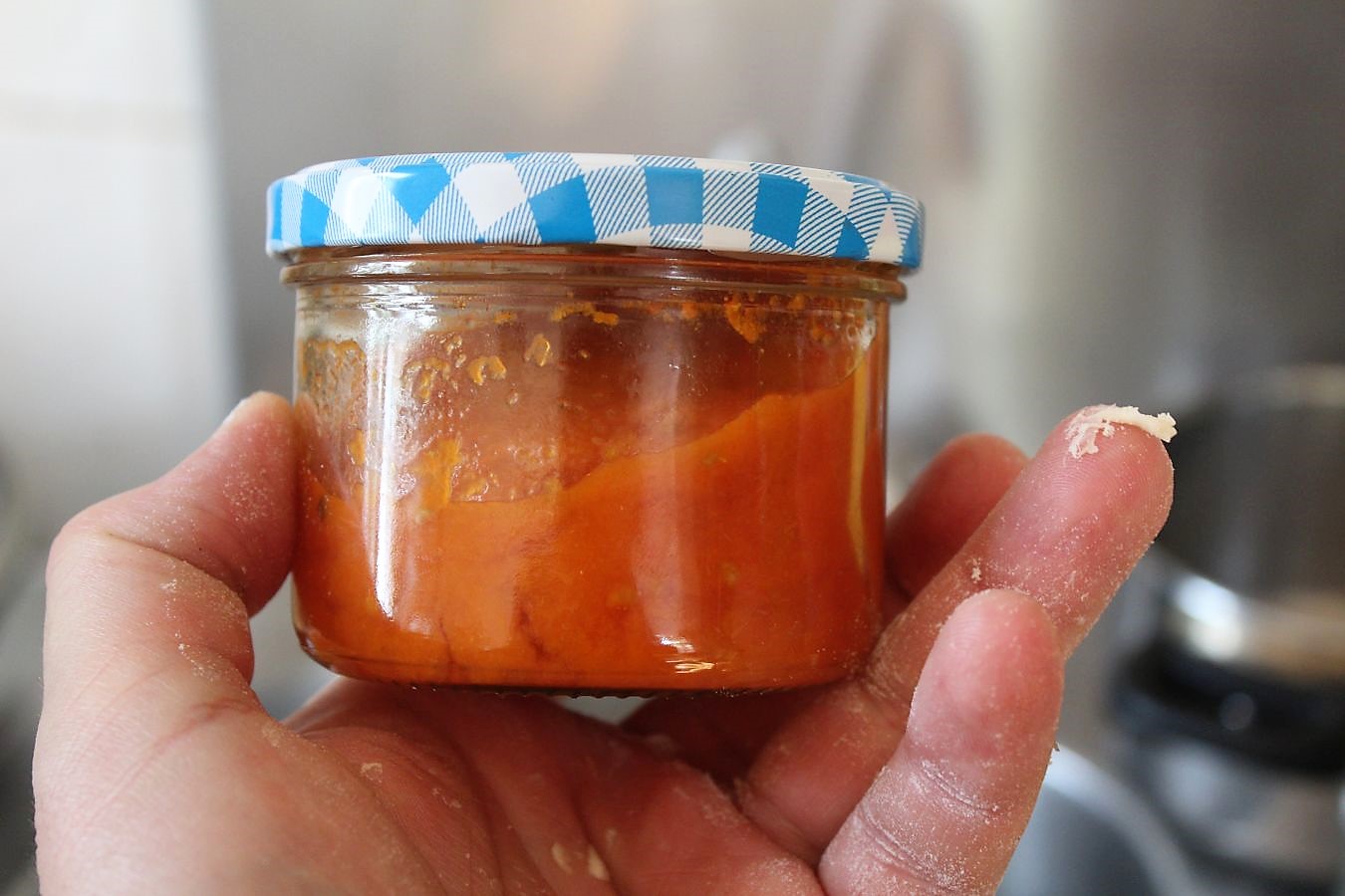 Alte Schraubgläser mit der Tomatensoße befüllen, dann sollte sie noch heiß sein.