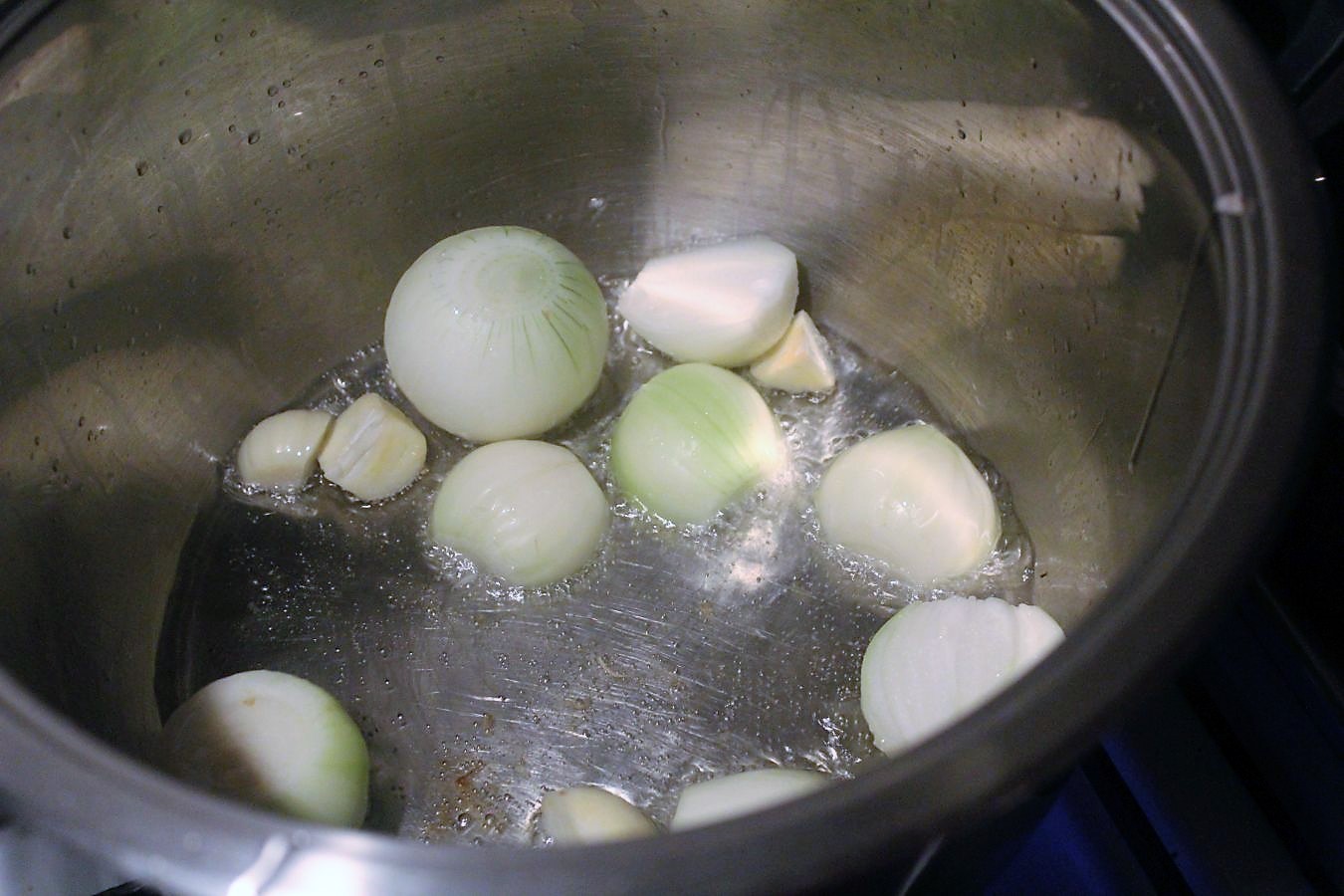 Zwiebeln und Knoblauch in den Topf werfen. In Olivenöl anschwitzen. Das Gemüse darf auch Röstaromen bilden.