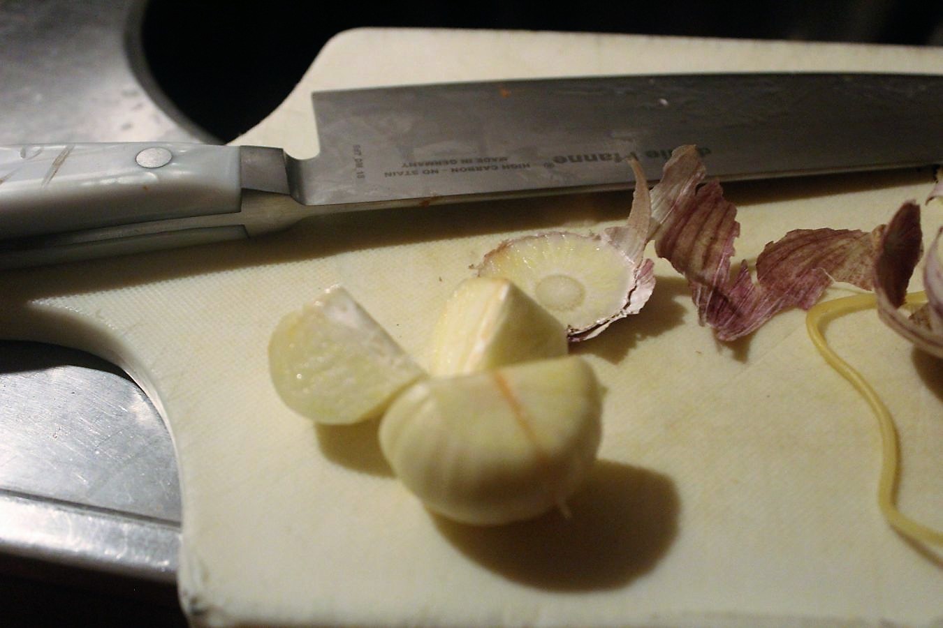 Zwiebeln und Knoblauch häuten. Man kann die Zwiebeln grob zerkleinern, vielleicht halbieren, oder vierteln. Man kann sie auch ganz lassen, weil am Ende sowieso alles püriert wird.