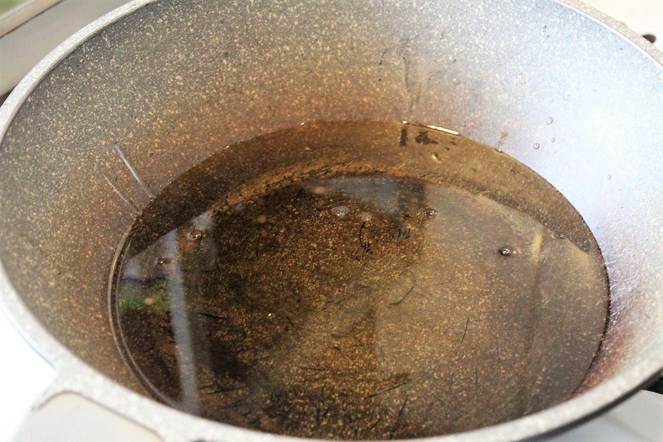 Einen Liter Pflanzenöl im Topf, oder im Wok erhitzen.
