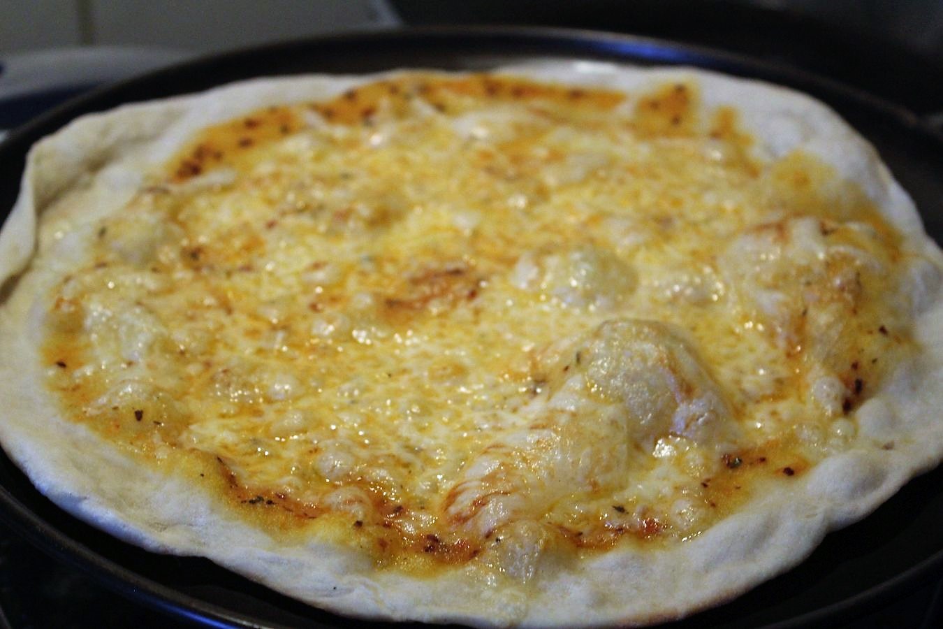Die Pizza kommt aus dem Ofen, ist gut aufgegangen, hat ordentlich Blasen geschlagen, der Käse ist geschmolzen.