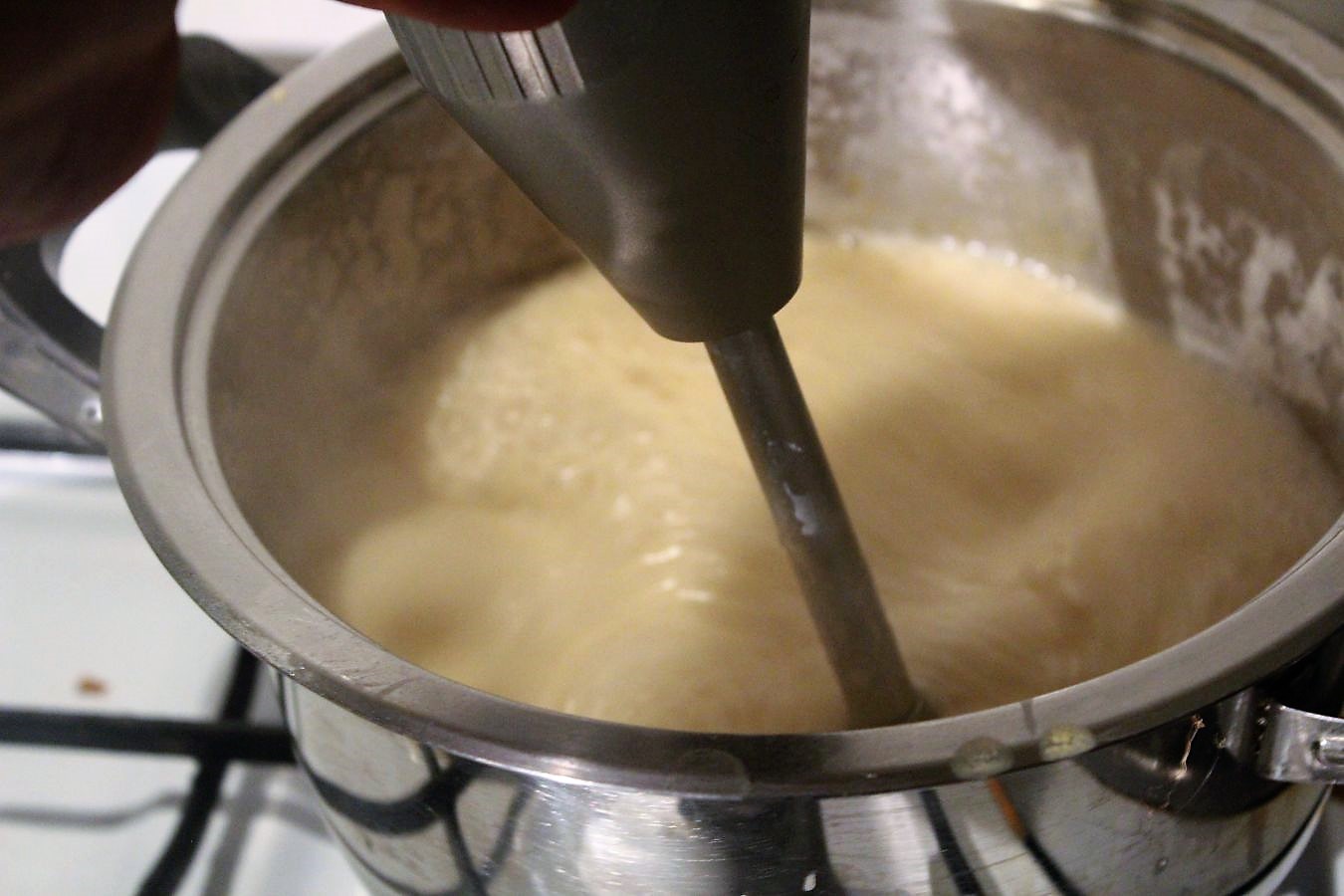 Handrührer, oder einen Pürierstab in den Topf stellen und Herd wieder auf Vollgas stellen