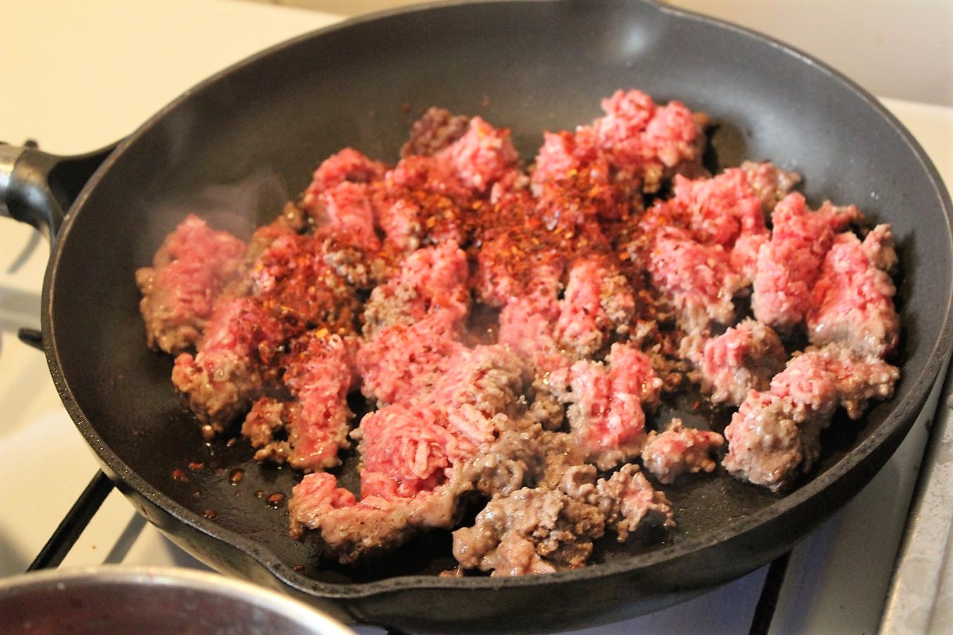 Pfanne erhitzen, volle Pulle auf der größten Platte, ich habe kein extra Fett verwendet. Wichtig, das Hackfleisch vorher verkneten, damit es hinterher nicht so aussieht wie Regenwürmer.