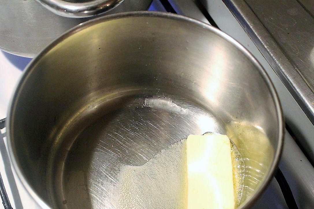 Parallel zu den Kartoffeln machen wir schnell die Soße, weil die 20 Minuten köcheln muss, damit der Mehlgeschmack weg ist.