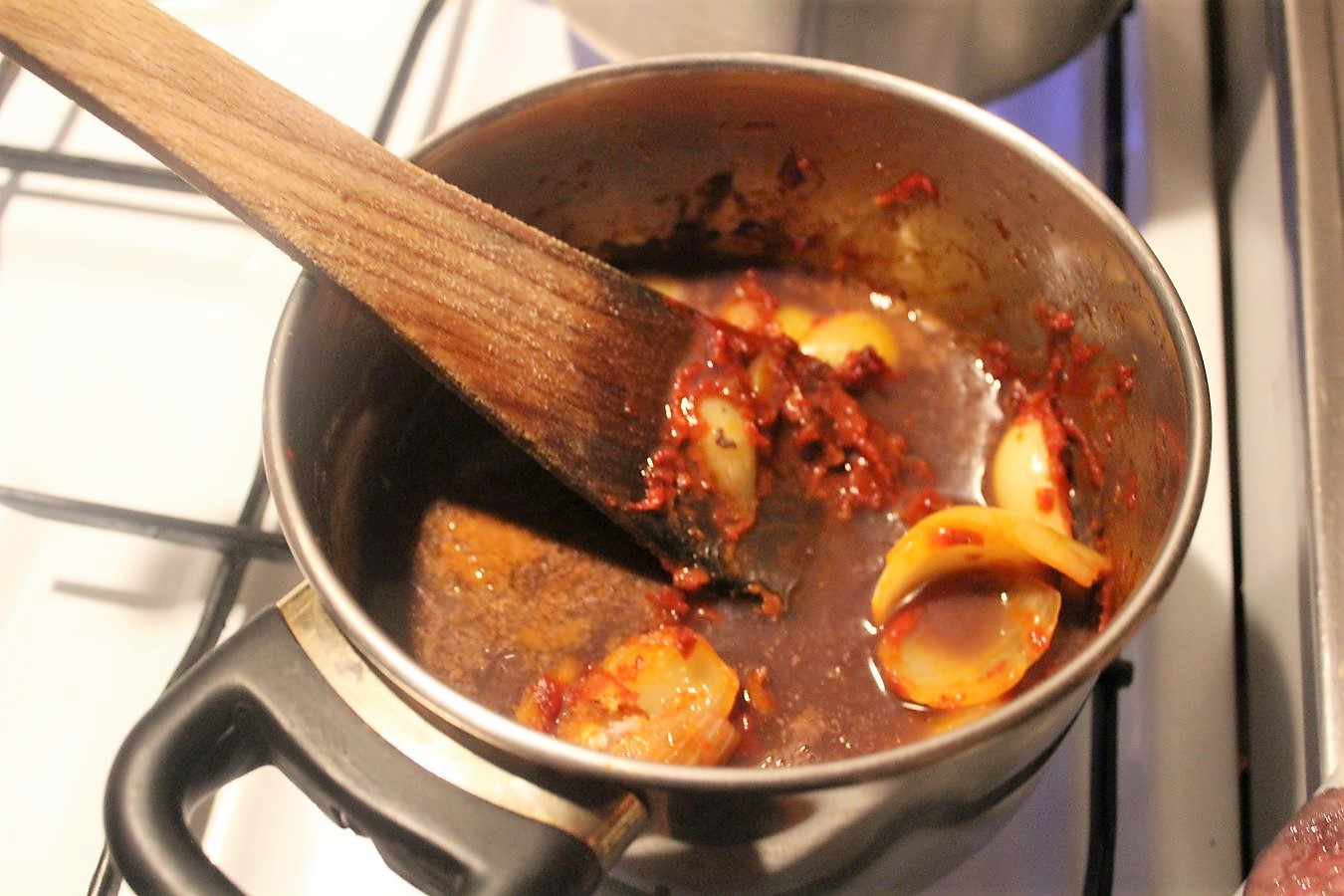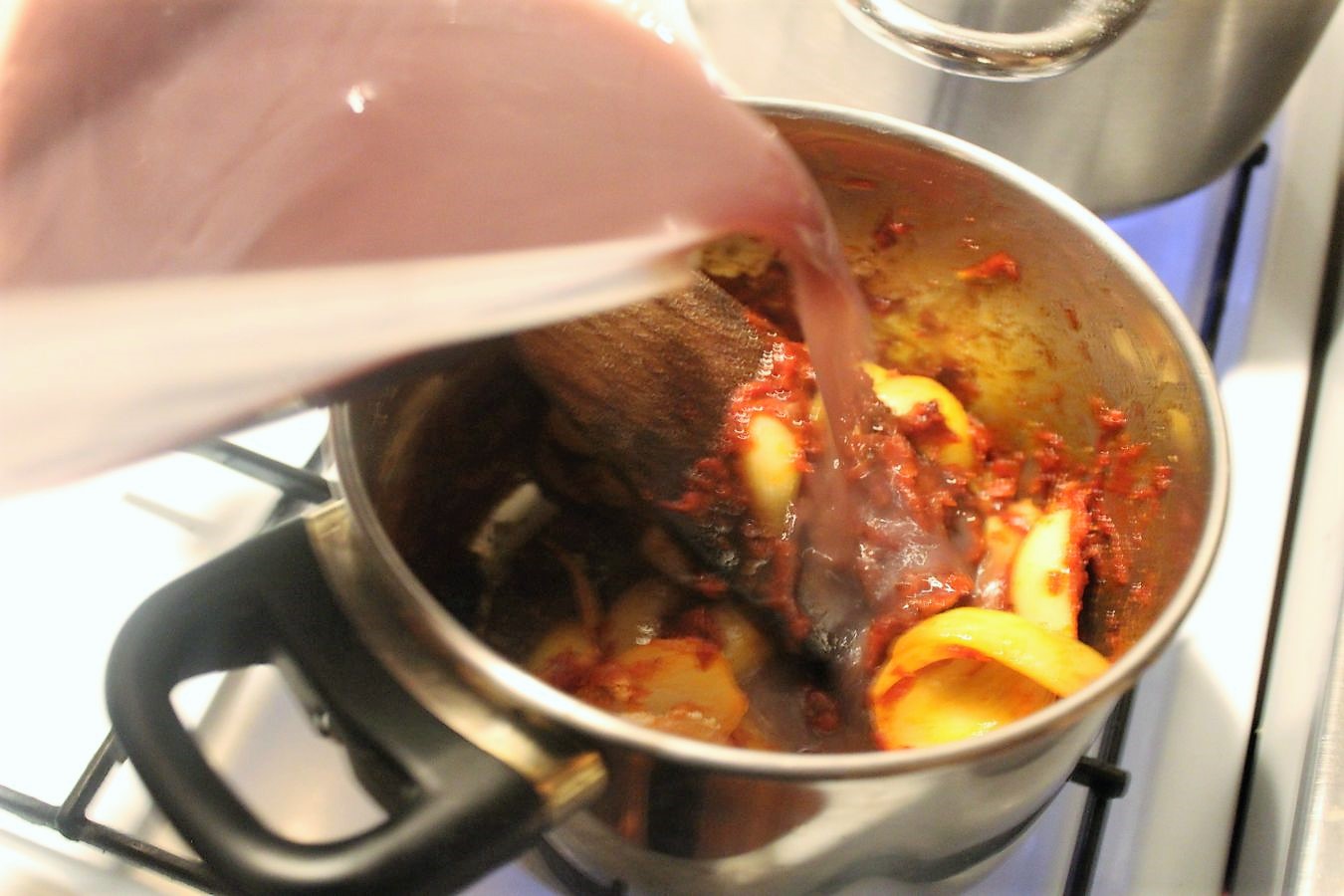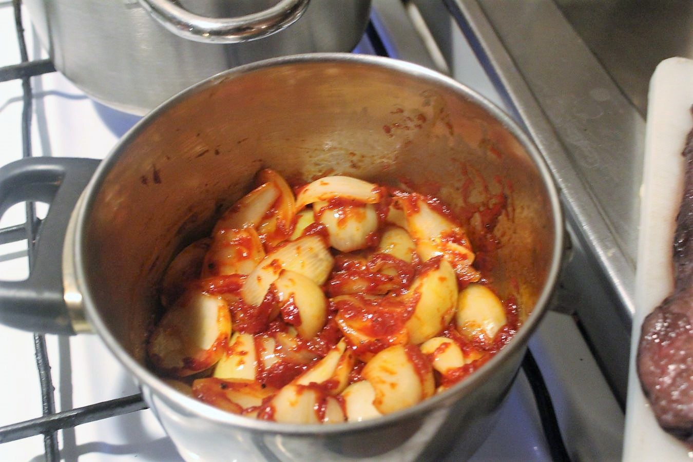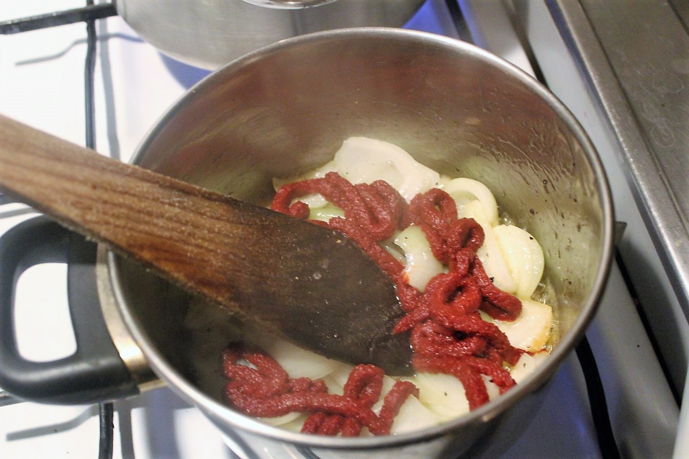 Wenn die Zwiebeln glasig sind, 100 Milliliter Tomatenmark in den Topf geben